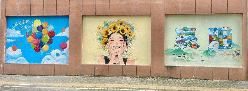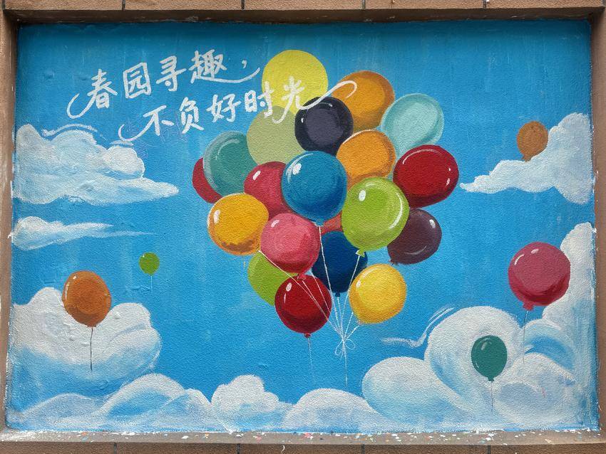 走进春园辖区,三幅风格鲜明、治愈感拉满的墙绘瞬间抓住眼球:左侧以澄澈蓝天为底,缤纷气球簇拥着“春园寻趣 不负好时光”的暖心标语,满是青春活力与生活热忱;