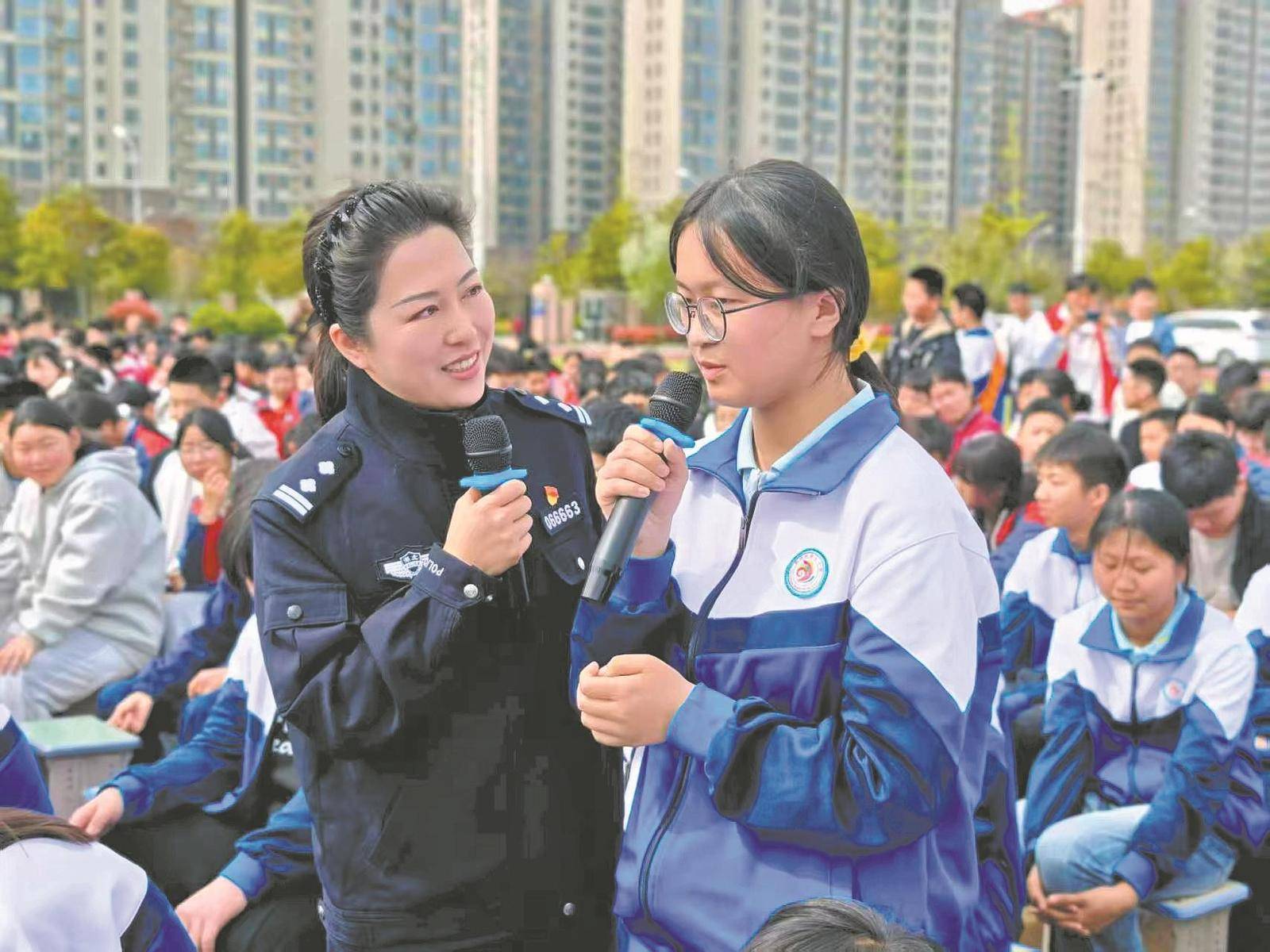 活动现场,民警从网络安全、中学生常见的违法行为等方面入手,向师生讲解预防诈骗、保护自身财产安全的方法。民警还重点讲解了校园欺凌的表现形式,指导同学们在面对校园欺凌时,学会运用法律手段保护自己。图为民警与学生进行现场互动。(来源:襄阳日报 陈莉莉 通讯员 杨艳辉 摄)