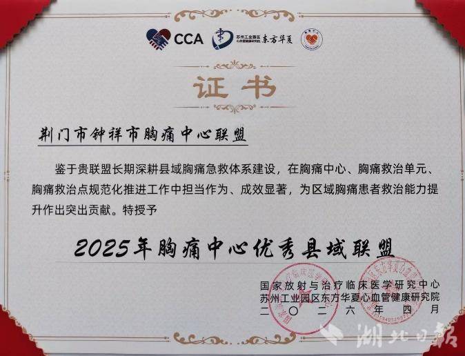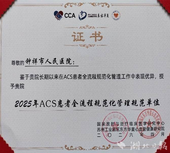 湖北日报客户端讯(通讯员杨璐)近日,第十五届中国胸痛中心大会(CCPCC 2026)在香港、深圳双城联动召开。凭借在急性胸痛救治领域的突出表现,钟祥市人民医院胸痛中心一举斩获“2025年ACS患者全流程规范化管理规范单位”“2025年胸痛中心优秀县域联盟”两项国家级荣誉。这标志着该院胸痛中心建设、急性冠脉综合征(ACS)规范化救治及县域协同救治体系均获全国权威认可。