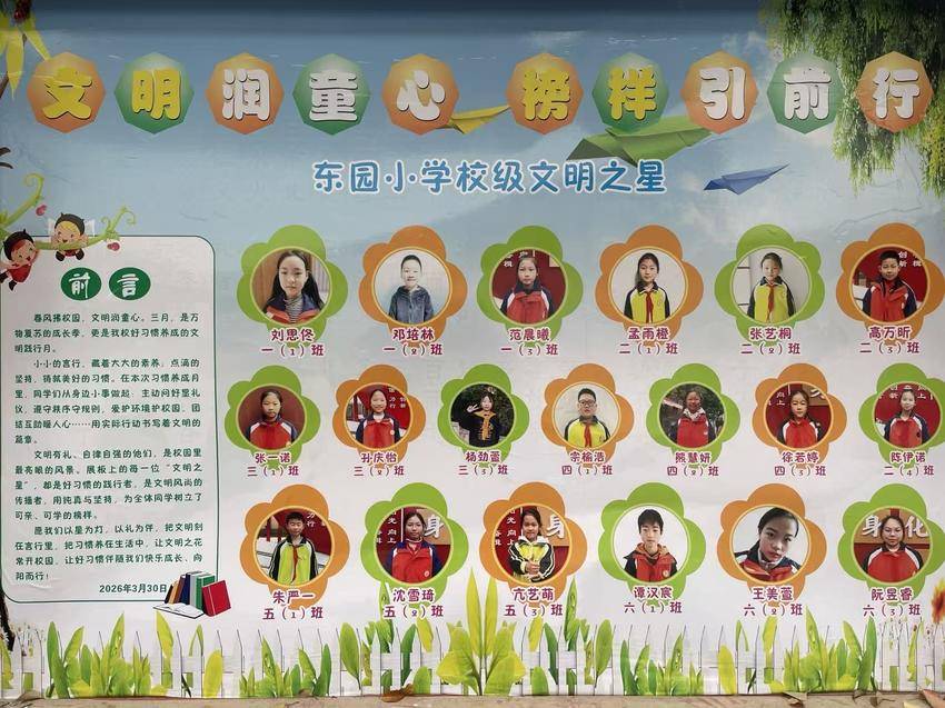 活动开展期间,学校紧紧围绕“润”文化育人理念,从行为规范、学习习惯、文明礼仪、安全管理、文明用餐五大维度,细化学生习惯养成具体标准与要求,将养成教育全方位融入日常课堂教学、课间活动及校园生活各个环节,推动养成教育走深走实、落地见效。各班立足“润”文化内核,积极打造规范整洁、特色鲜明的班级文化阵地,科学规划教室功能区域,精心设置学生作品展示、荣誉表彰公示等特色板块,让教室成为滋养学生心灵、涵养优良习惯的温馨育人空间。与此同时,学校有序开展多层次星级学生评选活动,充分发挥优秀学生榜样示范引领作用,有效激发全体学生争先创优的积极性,引导学生自觉践行文明行为,争做乐学向上、文明有礼的东园学子。