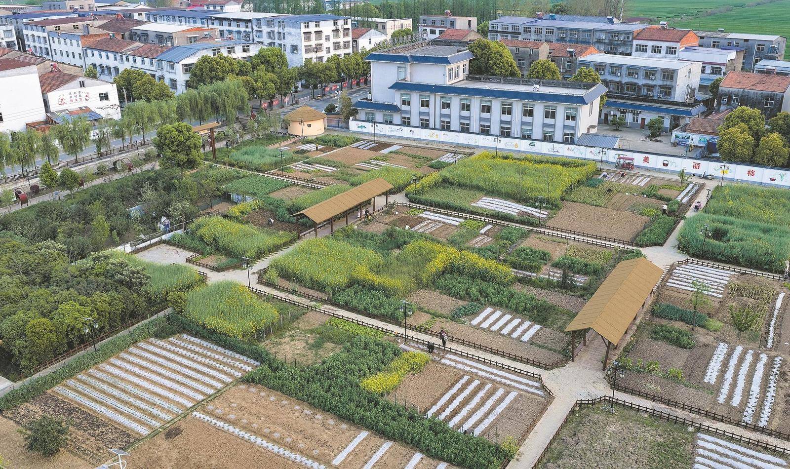 4月5日,空中俯瞰襄阳高新区团山镇施坡社区景观化菜园,居民在景观菜园中劳作、休闲。地处城乡接合部的施坡社区将居民菜园规整,加上木质廊架、文化墙等与菜地相映成趣,既保留农耕烟火气,又打造出集农事体验、休闲观光于一体的社区公共空间,绘就城郊乡村振兴新图景。(来源:襄阳日报 王虎 通讯员 蔡俊民 摄)