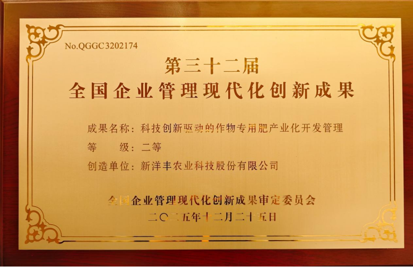 4月9日,2026年全国企业管理创新大会在北京举行,第三十二届全国企业管理现代化创新成果同期发布。新洋丰农业科技股份有限公司凭借《科技创新驱动的作物专用肥产业化开发管理》成果,从全国966项申报成果中脱颖而出,荣获全国企业管理现代化创新成果二等奖,标志着其在作物专用肥全产业链开发方面的实践获得国家级权威认可。