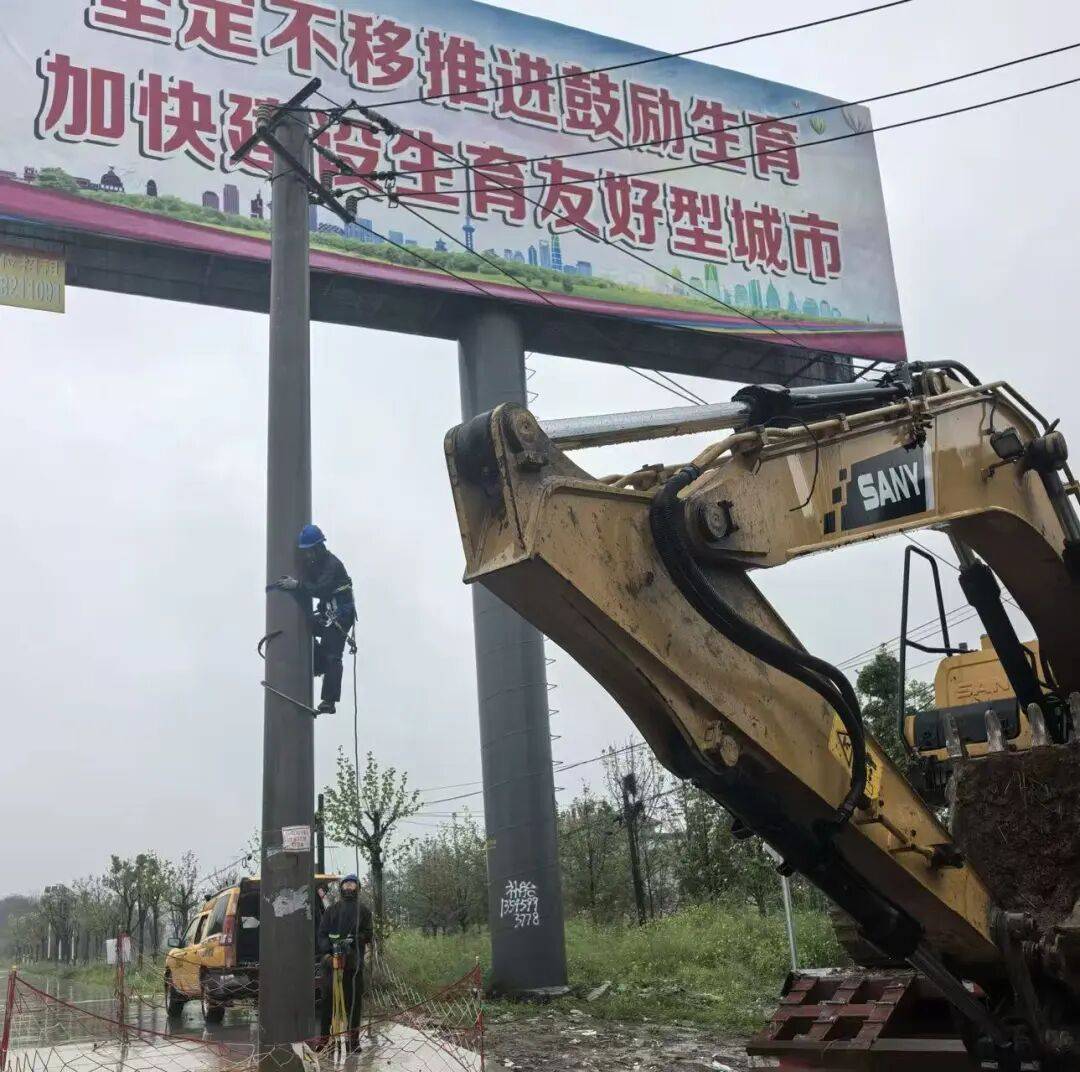 南湖新村发生电线杆倾倒,供电部门迅速出动人员23名、机械2台、车辆8台,调集电杆8根、导线2000米开展抢修。在镇村干部积极协调下,及时克服原杆位无法重新立杆的困难,移位组立新杆。
