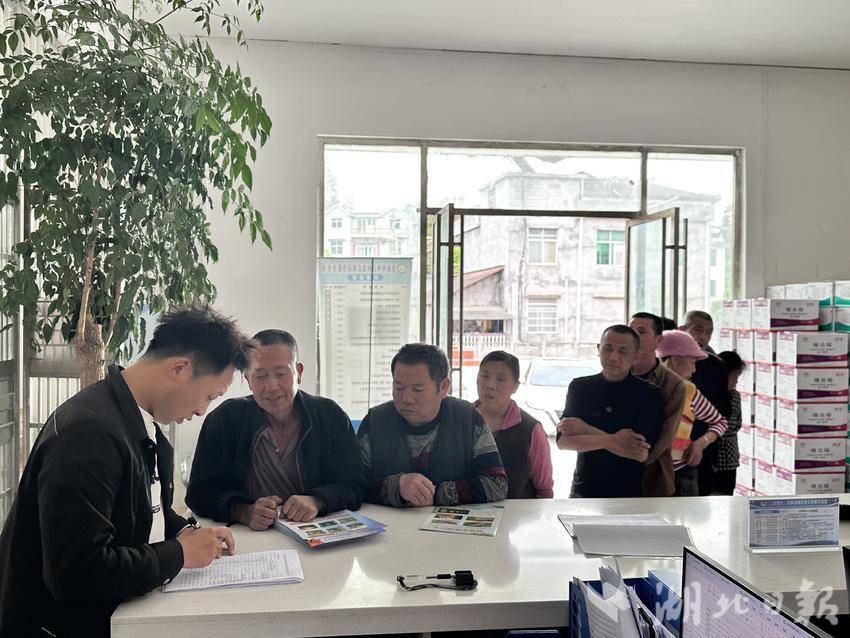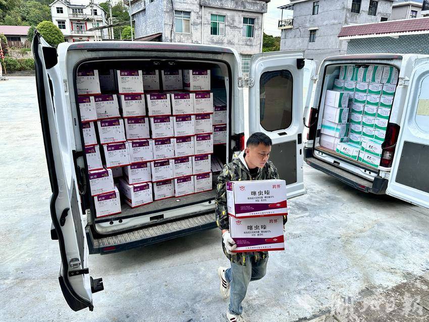 在二虎寨村药品发放现场,工作人员逐一核对果农种植面积,按照比例免费发放高效低毒防控药剂,并详细讲解用药剂量、配比方法及安全间隔期。
