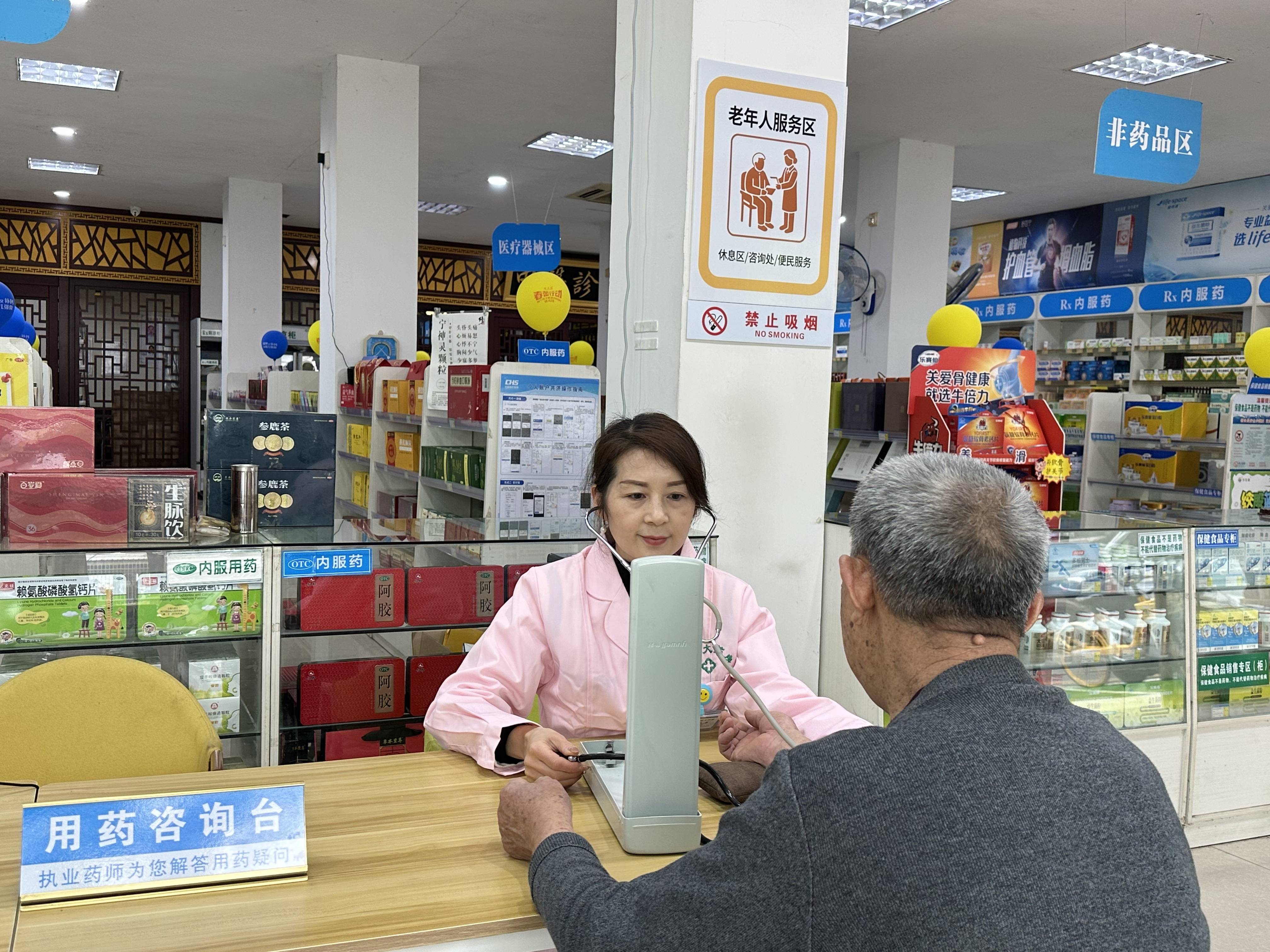 该示范药店从细节入手,设置了独立的适老服务区域。服务台统一配备老花镜、放大镜、简易急救包,并提供血压计、血氧仪等健康检测设备;同时,因地制宜开展中药代煎等特色项目。药店还开辟了老年购药绿色通道,为高龄、独居及行动不便的老人提供优先购药、专人陪同服务,协助完成从处方开具、缴费到取药的全流程。