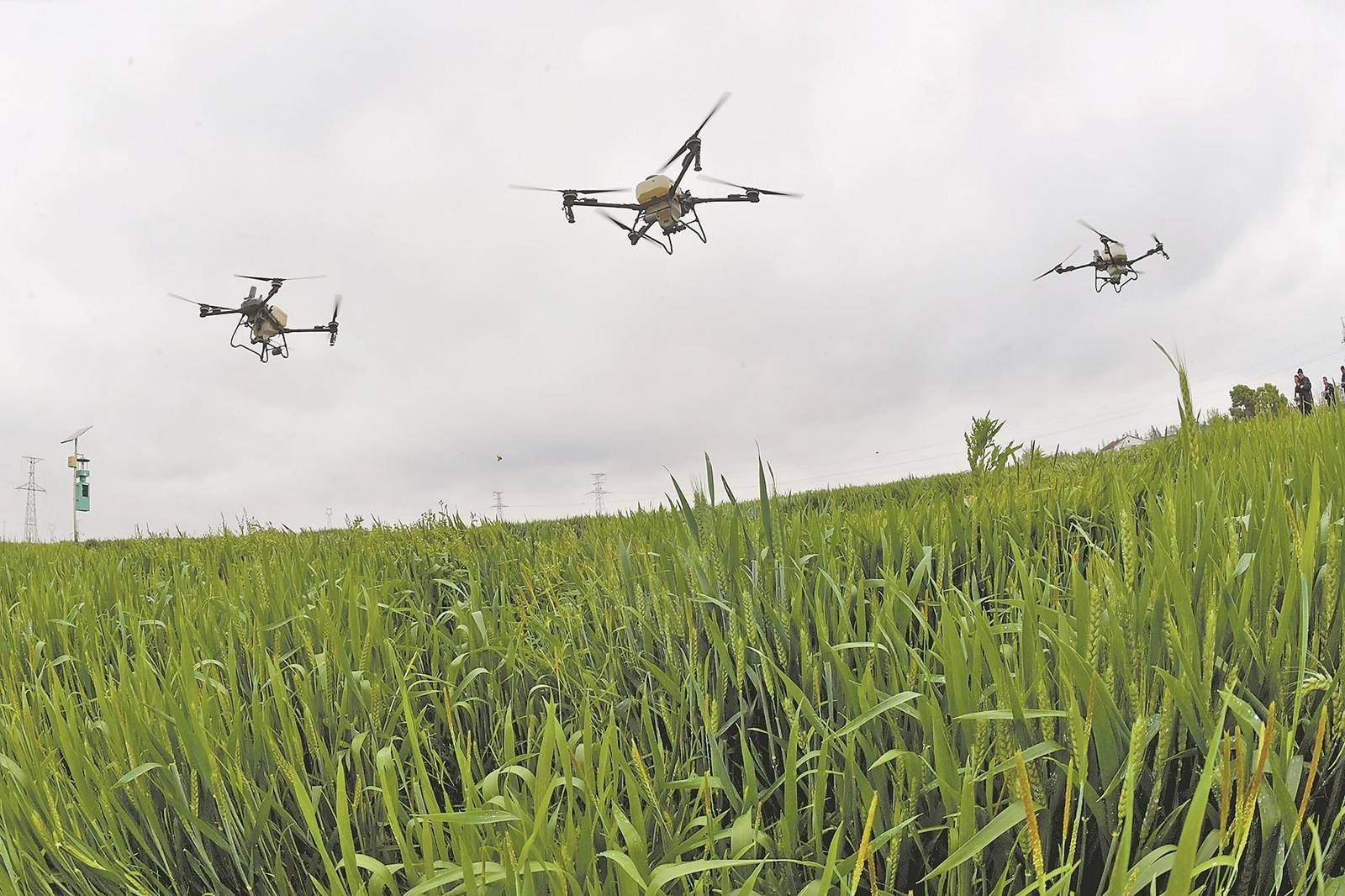 4月9日,在樊城区牛首镇黄丰村,无人机在防治小麦赤霉病。