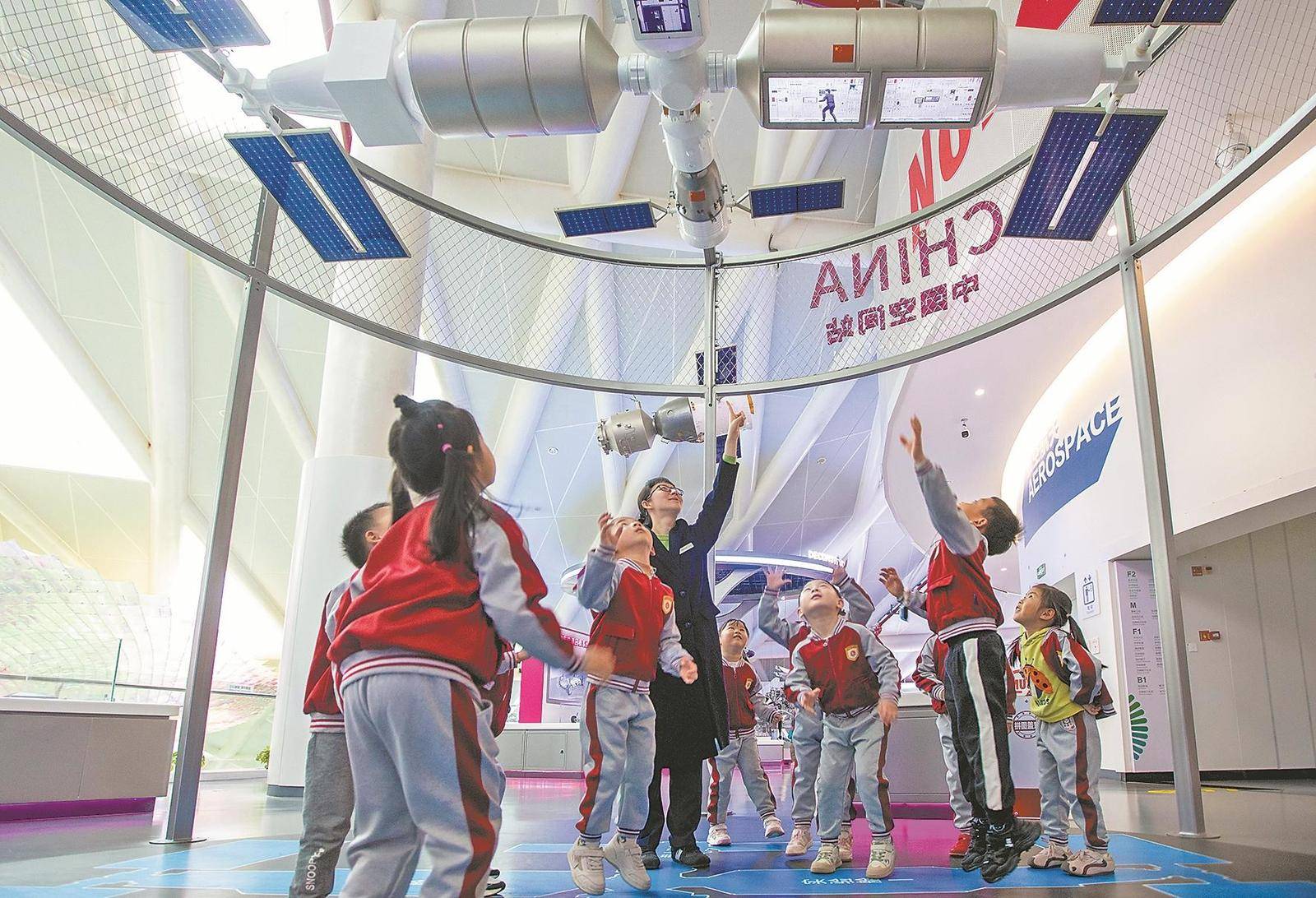 4月10日,在“载人空间飞行国际日”即将来临之际,樊城区区直机关幼儿园雍江分园组织小朋友们走进市科技馆,开展航天科普教育活动。小朋友们在市科技馆讲解员的专业讲解下,近距离学习航天知识、感受航天魅力。(来源:襄阳日报 李旭晖 通讯员 宋雯 摄)