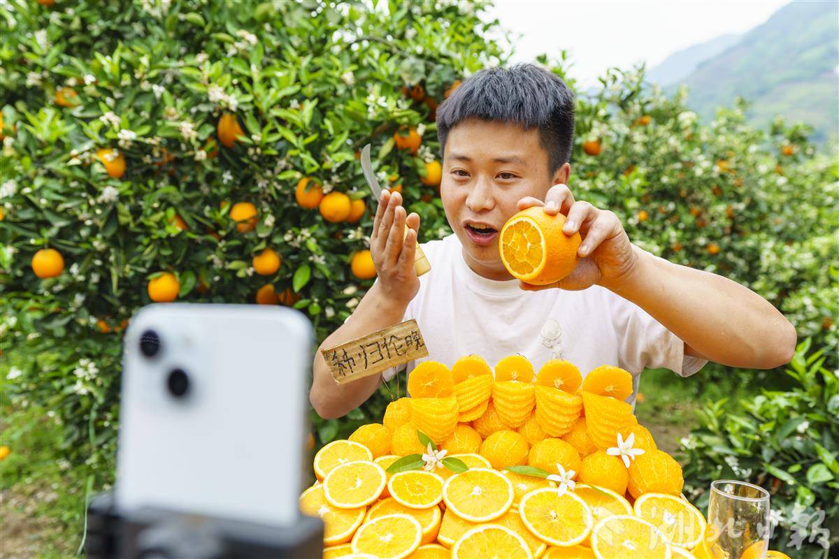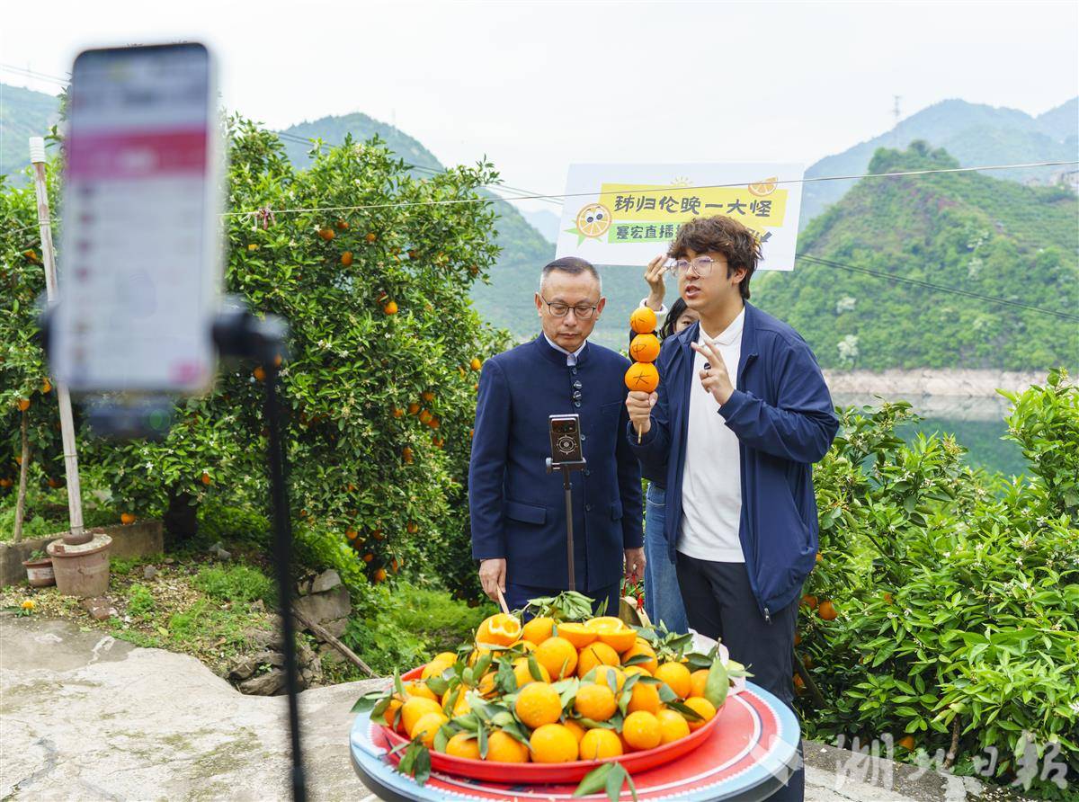 湖北日报讯(记者黄善君 通讯员李彩云郑可欣 邓飞宇)“欢迎来到蹇爹爹直播间,秭归伦晚一大怪,蹇宏直播按吨卖……”4月15日,在宜昌市秭归县沙镇溪镇千将坪村江边的橙园里,楚商联合会秘书长蹇宏化身主播,为秭归伦晚脐橙带货。一款“9999元每吨”的助农链接最终成交8单,销售额达79992元,一度让直播间位居生鲜榜第一名。连同常规链接售出的近千单,这场三小时直播累计带动销售11.8万元。