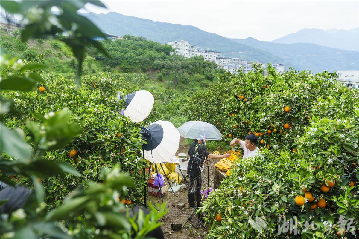 4月16日,秭归县沙镇溪镇千将坪村,主播在脐橙园中直播销售秭归脐橙。 周仕伟 摄