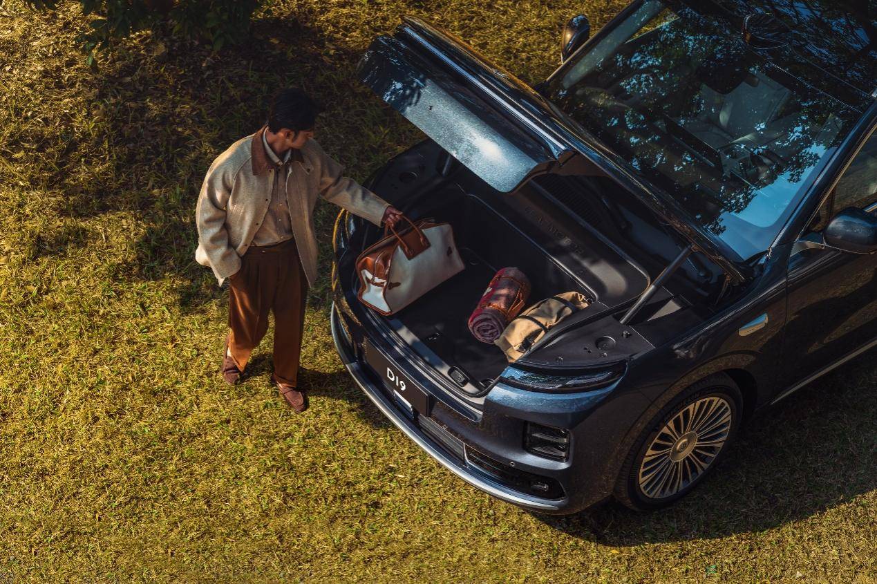 D19车身侧面采用天空之境纯平侧窗,零阶差设计媲美百万豪车工艺,兼顾颜值与驾乘静音性;银辉之冠拼色车顶弱化厚重感,搭配21英寸向往之境轮毂与米其林轮胎,高级感十足。新车推出松谷绿、光电白、液态银、天幕灰、金属黑共五款自然共生车色,其中松谷绿采用巴斯夫豪华品牌同源漆料,远观如松、近看含光,尽显自然高级质感。
