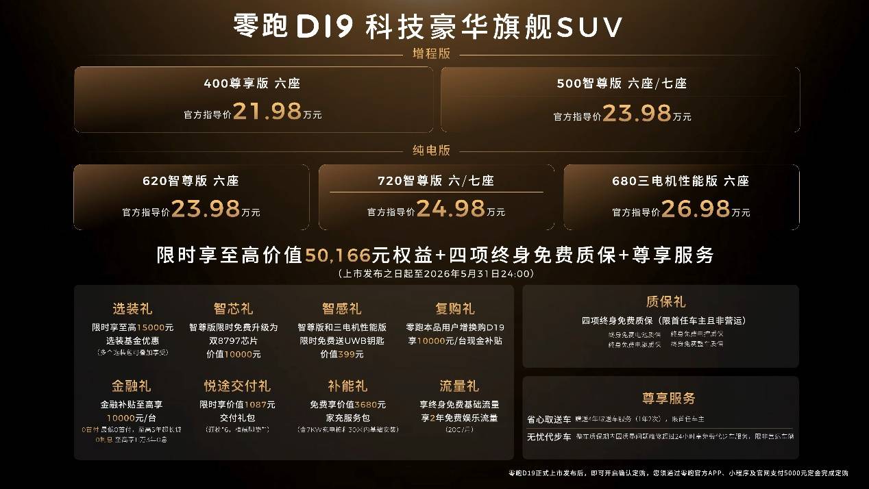 4月16日,零跑旗舰D平台首款车型——零跑D19正式上市,售价21.98-26.98万元。新车定位“科技豪华旗舰SUV”,以旗舰级的美学、舒适、续航、智能、驾控、安全六大全维体验,彻底打破“旗舰即高价”的行业陈规,旨在重塑30万内全尺寸SUV的价值标杆,让真正的旗舰体验成为更多家庭的幸福之选。发布会现场,零跑D系列代言人费翔先生亲临助阵,零跑科技创始人、董事长、CEO朱江明先生为费翔交付首台零跑D19,双方共同见证这款旗舰车型正式上市,标志着零跑品牌向上与科技普惠迈入全新阶段。