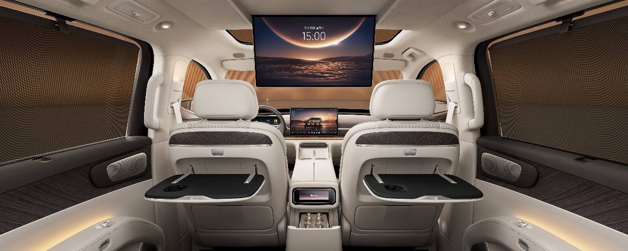 座椅采用12层奢享级结构,全车座椅支持电动调节,并实现6座加热、4座吸入式通风与10点式按摩,二排右侧零重力座椅支持120°零压躺姿、4向腿托与ABTS一体式安全带,1.9米乘员也能享受悬浮式休憩体验。第三排为同级超大贵宾座,支持131°靠背无极调节、座椅加热与一键电动翻折,搭配专属双扶手与全平地台,彻底解决传统三排“小板凳”痛点。此外,二/三排专属遮阳帘遮蔽率分别达93.2%、91%,全方位兼顾舒适与隐私。