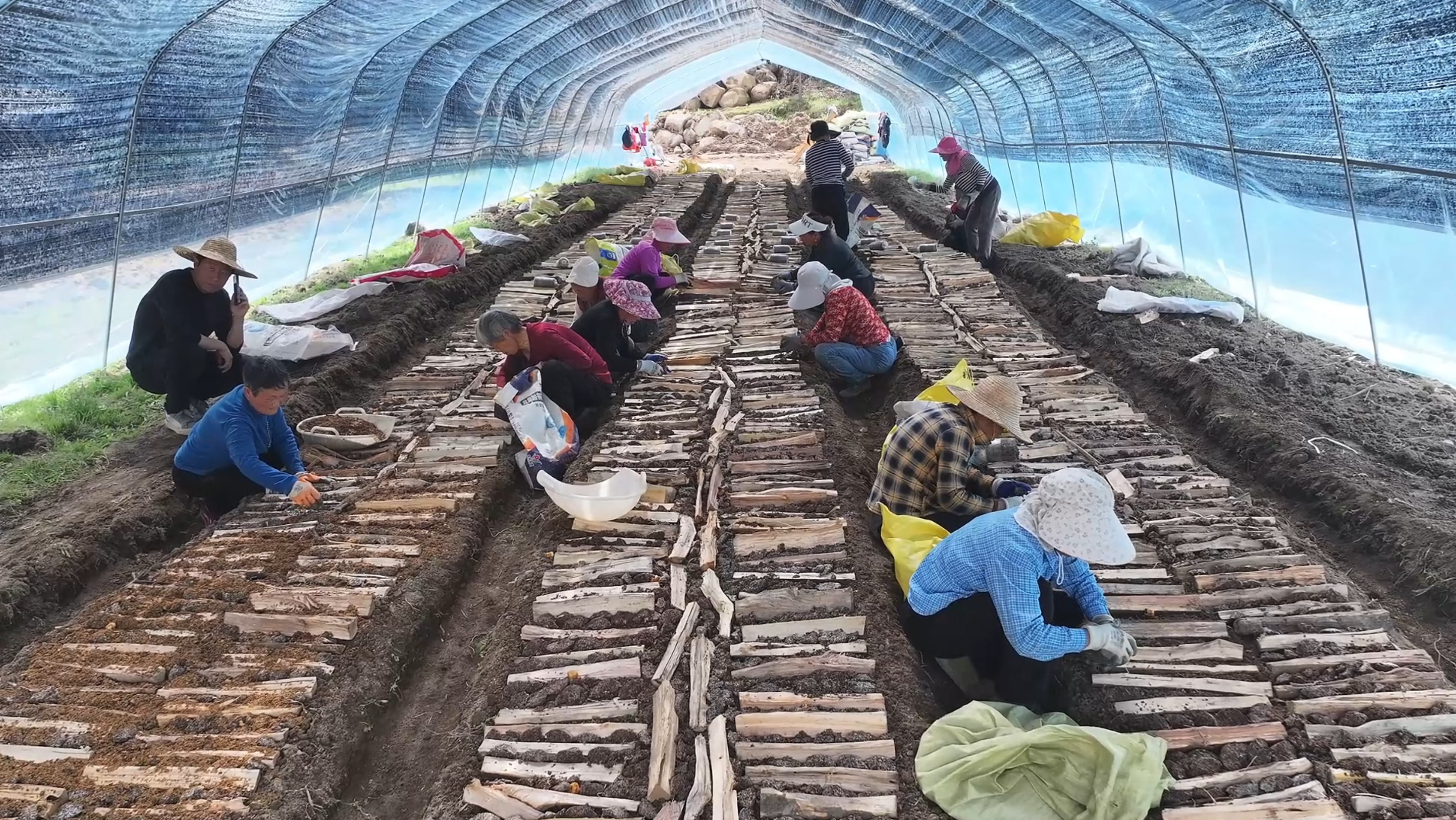 大棚内,村民们正按照技术要求,起垄、摆菌种、放木材、撒腐殖土、下种,每一步都默契十足、秩序井然。这些毛慈菇将在大棚内生长2至3年,才能进入收获期。