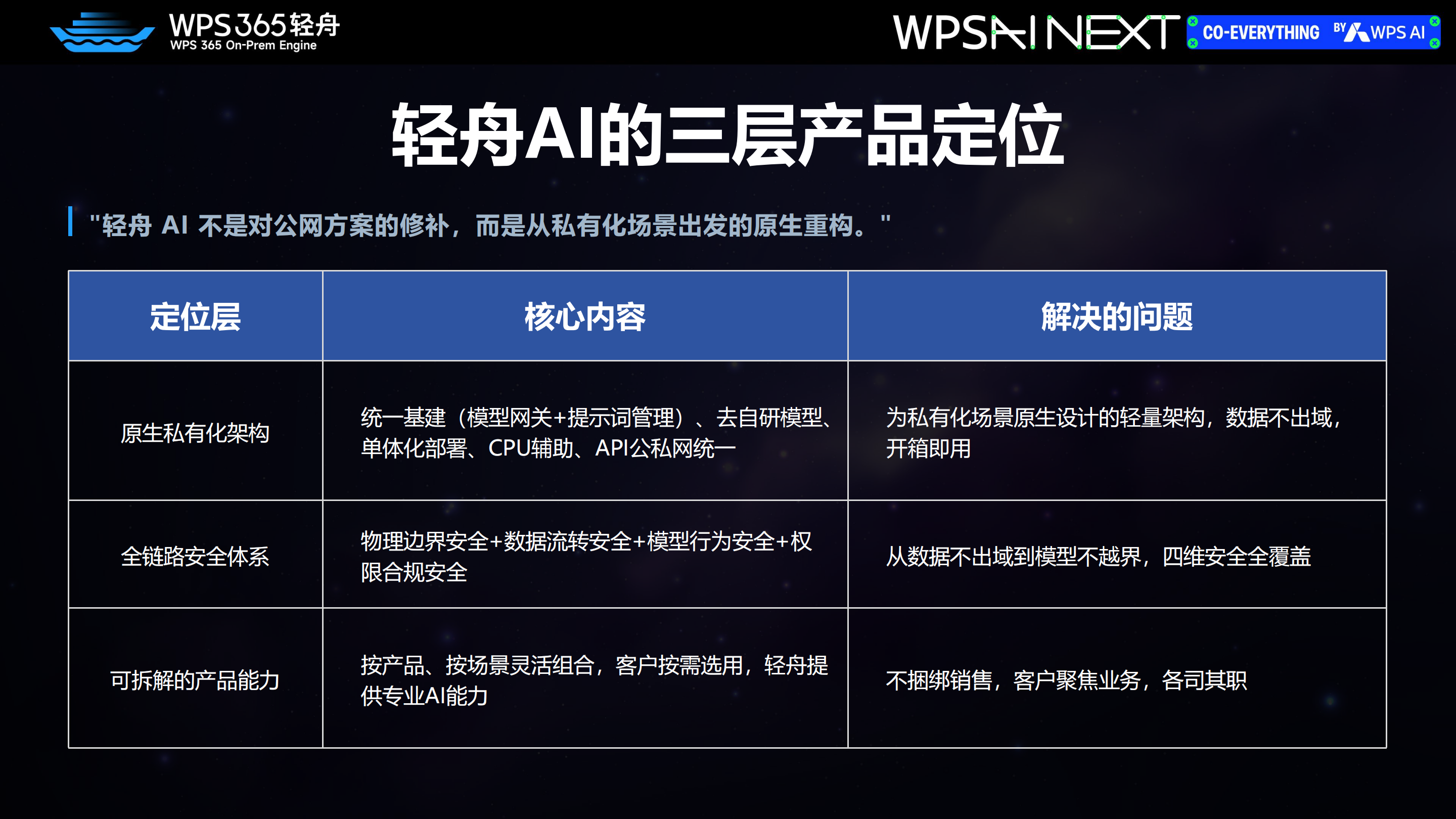 湖北日报讯(记者张真真、通讯员林一丹)4月22日,金山办公在武汉发布协同办公行业首个私有化AI办公解决方案——WPS 365轻舟AI,面向组织级用户提供安全可控、部署轻量、效果可控的私有化AI服务。轻舟AI破解了组织数据不出域、通用AI不懂业务、传统私有化方案过重过贵等行业痛点,具备零改造成本、零新增算力、零等待周期等优势。