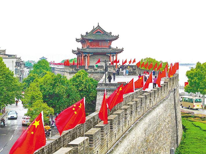 9月28日,襄阳临汉门城楼上,一面面崭新的五星红旗迎风舒展。