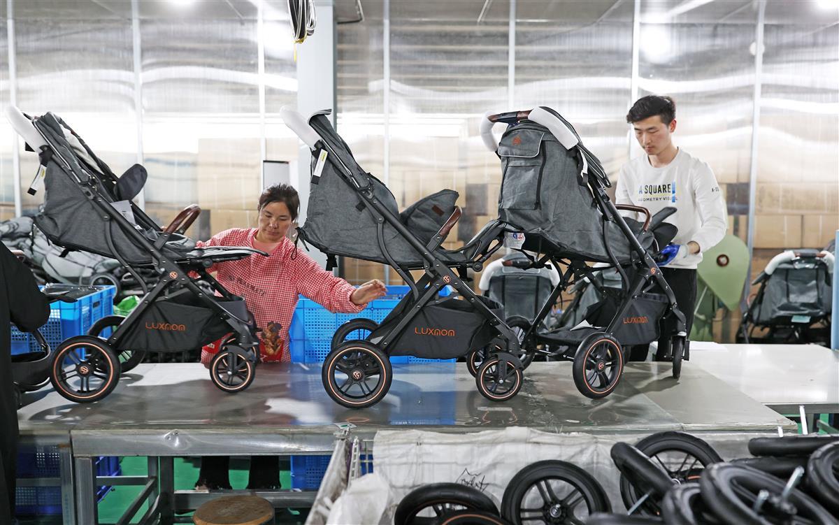 汉川市洋田塑料制品有限公司内,工人正在生产婴儿手推车。(湖北日报全媒记者何宇欣摄)