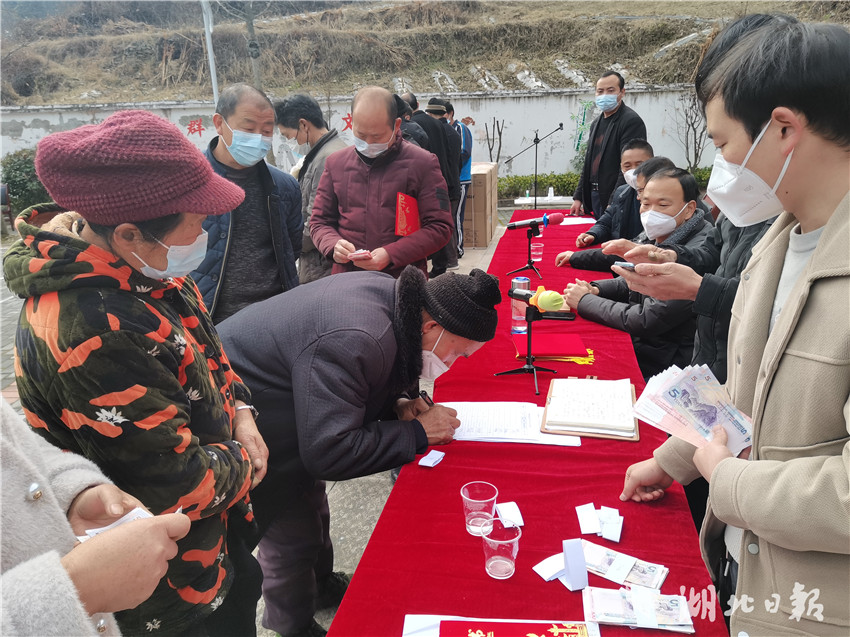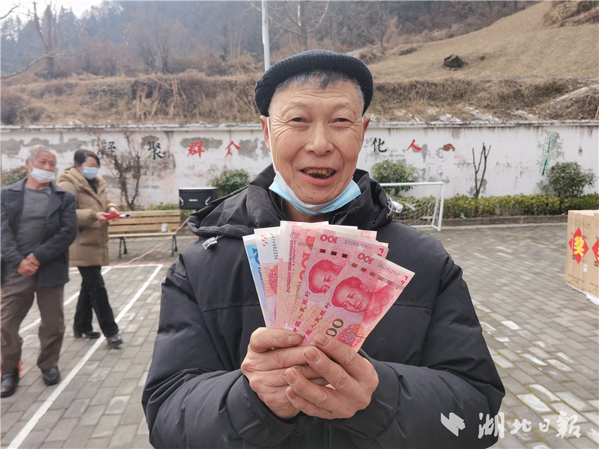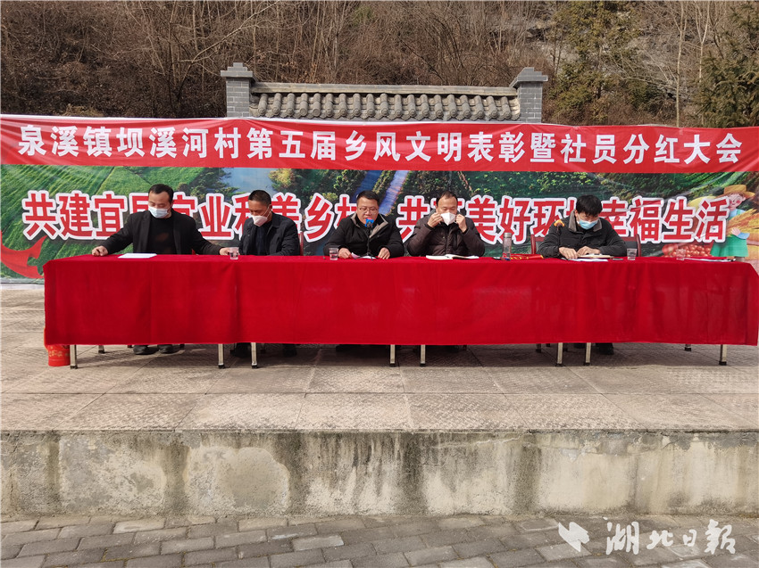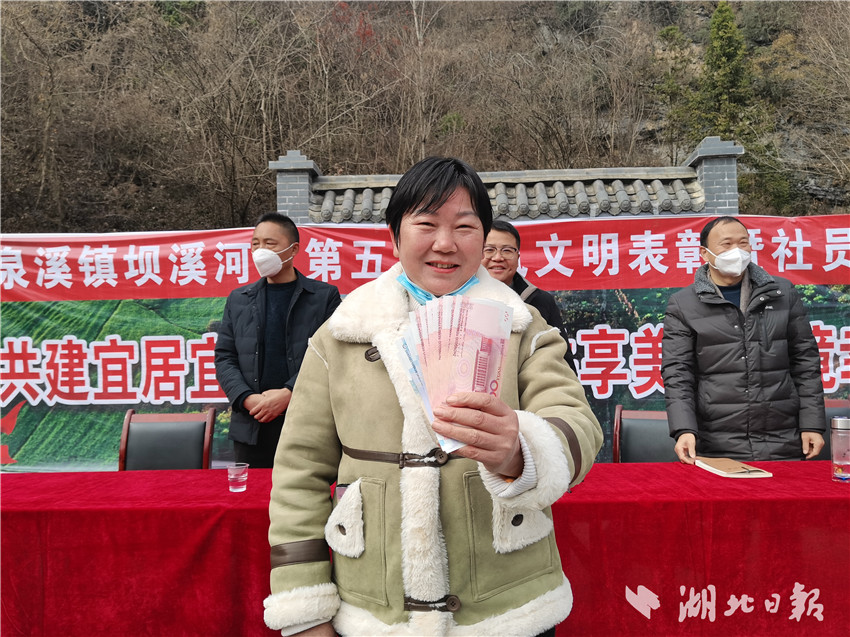 湖北日报客户端讯(通讯员 郭军 吴岩松)詹昌福,780元 ;瞿世兰,1040元;黄朝国,520元……1月5日,竹溪县泉溪镇坝溪河村举行第五届乡风文明表彰暨社员分红大会,文化广场上人头攒动、热闹非凡,村民们个个脸上洋溢着灿烂的笑容。该村党支部书记、坝溪味道种养殖专业合作社副理事长李新春介绍,“本次共拿出10万余元,分给756名社员。”
