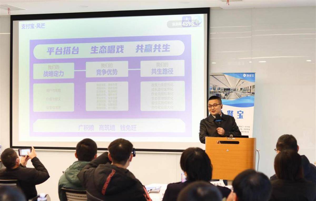 活动开始,支付宝中西部大区总经理杨直新先生发表讲话并致开幕词,提出以平台搭台和生态唱戏的模式实现整个业务的共赢共生。从支付宝的战略定力、竞争优势和共生路径三个方面阐述了合作理念和落地方案,让到场的合作伙伴对支付宝的政策、优势及打法有了全新的认识,点燃了现场伙伴的热情。