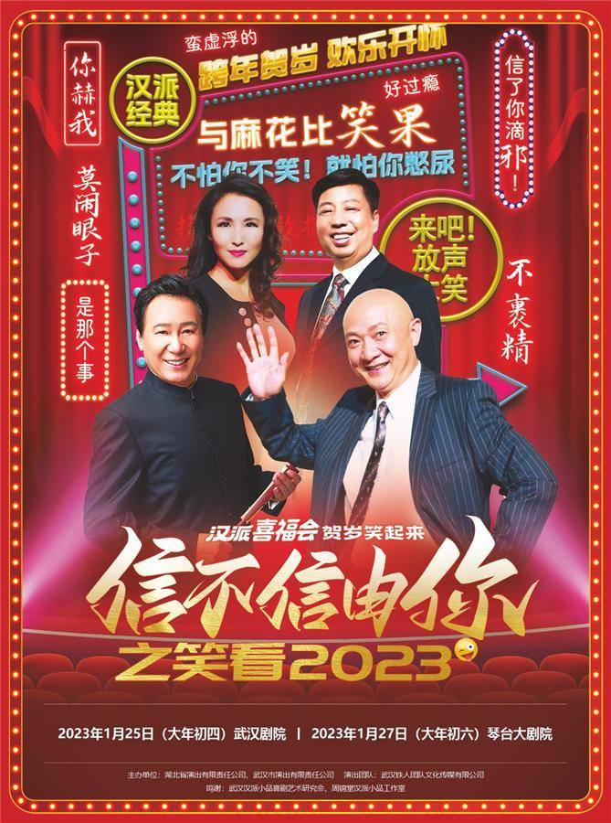 湖北日报讯(记者农新瑜、通讯员黄影、实习生刘子婧)“两三分钟一个笑点”“笑得合不拢嘴的100分钟”……又一台精彩的汉派贺岁喜剧来了!从湖北省演出公司获悉,由该公司与武汉市演出公司联合出品的“汉派喜福会——贺岁喜剧《信不信由你之笑看2023》”,将于1月25日(大年初四)在武汉剧院亮相首演,并于1月27日(初六)在琴台大剧院接连上演,随后于正月十五赴黄冈黄梅戏大剧院演出,用欢声笑语为广大观众送去新春的欢乐。