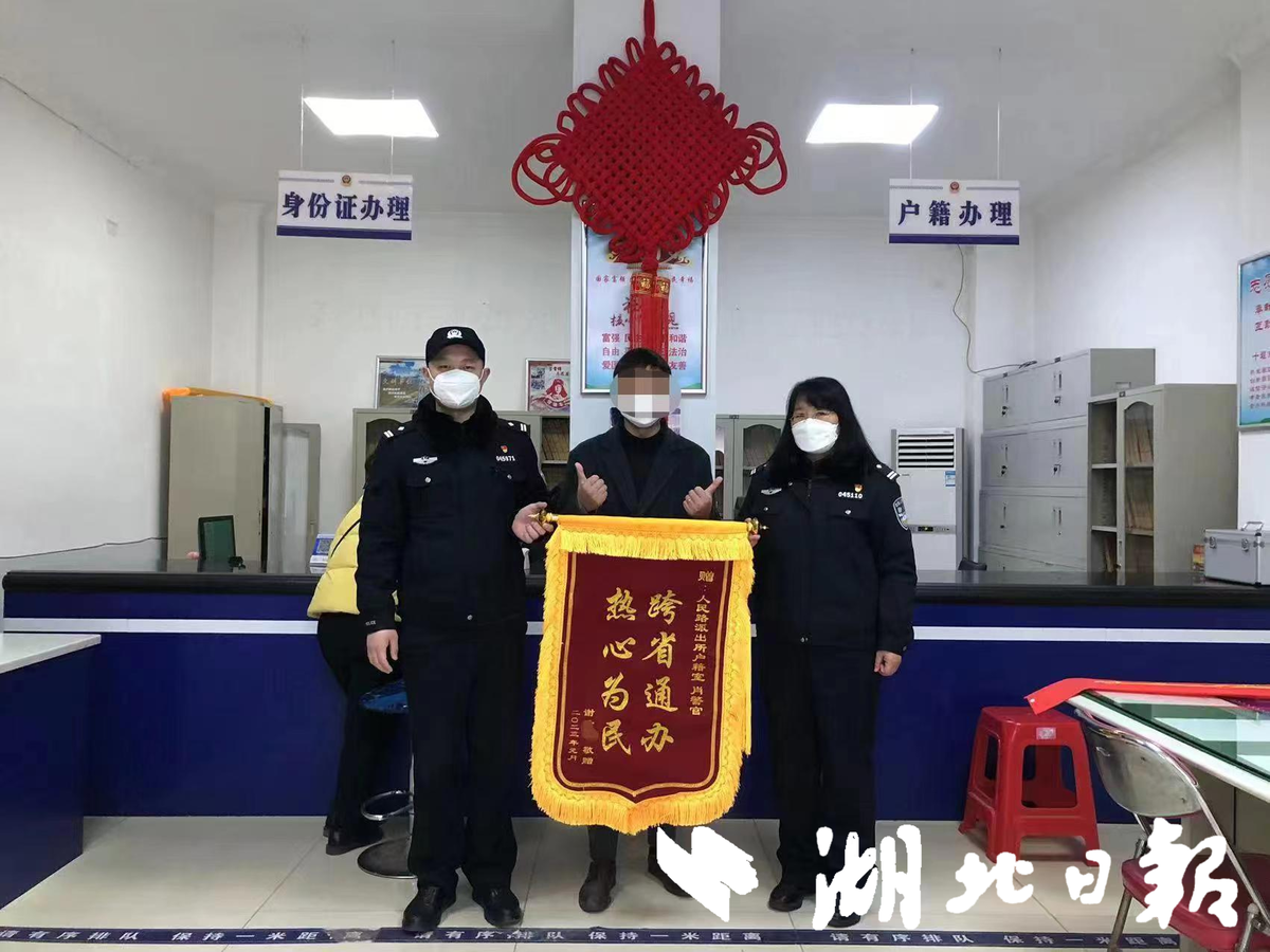 “可以了,等户籍地派出所审批通过我们就可以给你打印户口证明了。”谢先生办理的此项业务是十堰市公安局自省厅1月18日上线跨省通办系统后第一起跨省通办新生儿落户业务。办理完成后,谢先生带着一面“跨省通办,热心为民”的锦旗送到了人民路派出所户籍窗口表示感谢。