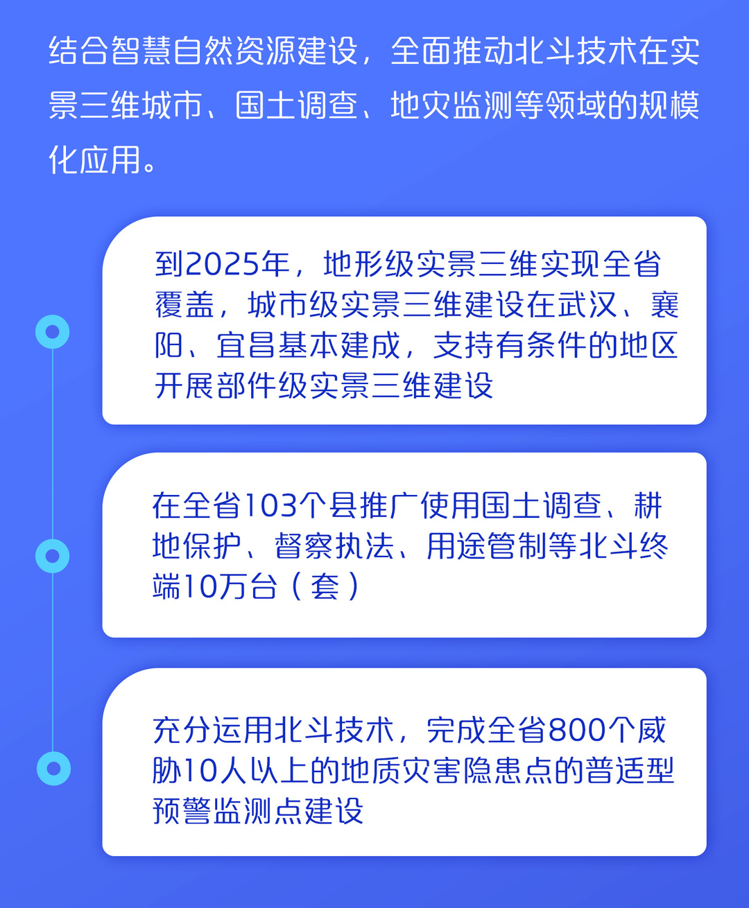 以超常规手段,以北斗在我省交通、水利、农业、自然资源、城市管理等重点行业,武汉、襄阳、宜昌等重点区域,以及大众消费领域的规模化应用为重要突破口,带动我省北斗企业加快发展壮大。