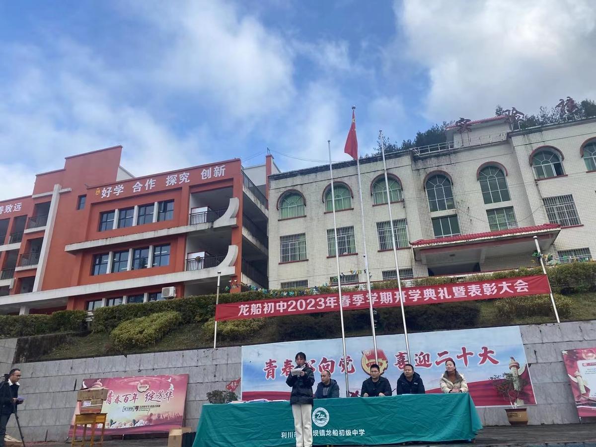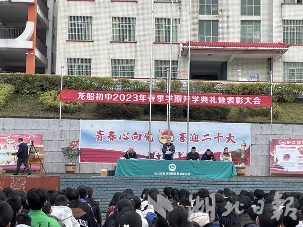 湖北日报客户端讯(通讯员 冉雪峰)2月9日,利川市柏杨坝镇龙船初级中学举行了隆重而热烈的开学典礼。开学典礼在庄严肃穆的升旗仪式下拉开序幕,伴随着铿锵有力的国歌奏起,国旗队的同学以熟练的动作将国旗缓缓升起。