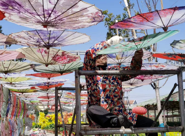 来到荷塘边,工人们正在长廊施工,“我们是旁边村子里的居民,我们两个人,一天两百块钱,两天就可以把这个景布完,一共有几百把油纸伞”,施工工人说道。