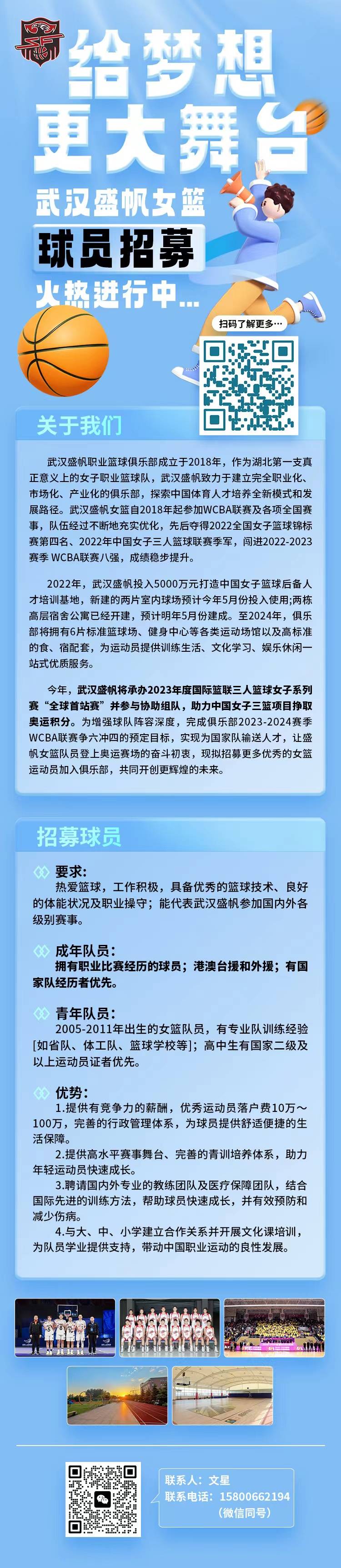 湖北日报讯 (记者郭晓明、通讯员王凡)3月7日,武汉盛帆职业篮球俱乐部通过官方微信号公开招募优秀的女篮运动员,“共同开创更辉煌的未来”。
