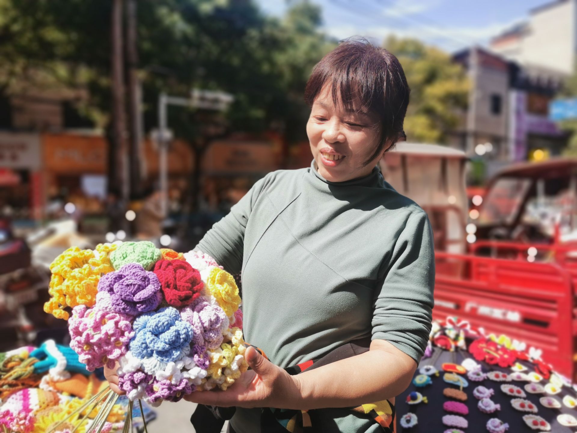 “街上一个阿姨,织的发卡栩栩如生,各种花朵更是一级棒……”口口相传的称赞让张晓红的手工制品名声大噪,张晓红的晚年生活也变得忙碌起来。不少居民特意前来找她制作花束,但每逢雨天,张晓红也无法出摊,这让她犯了难。
