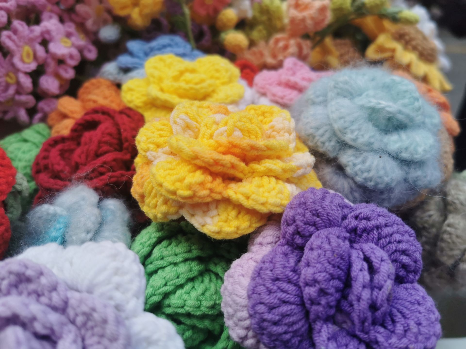 “我有一定的基础,不过做毛线钩织的小玩意,是最近学会的。”张晓红笑着说。原来,年轻时张晓红就喜欢打毛衣,凭借着精湛的打毛衣技术,张晓红退休后便在温泉开了一家“微雨辰风”毛线店。一边卖毛线一边打毛衣售卖。后来打毛衣的人少了,毛线生意渐渐淡了。2021年9月,她突然看到了一朵毛线钩织的鲜花,她就想着用毛线钩织手工花来展示,吸引大家买毛线。