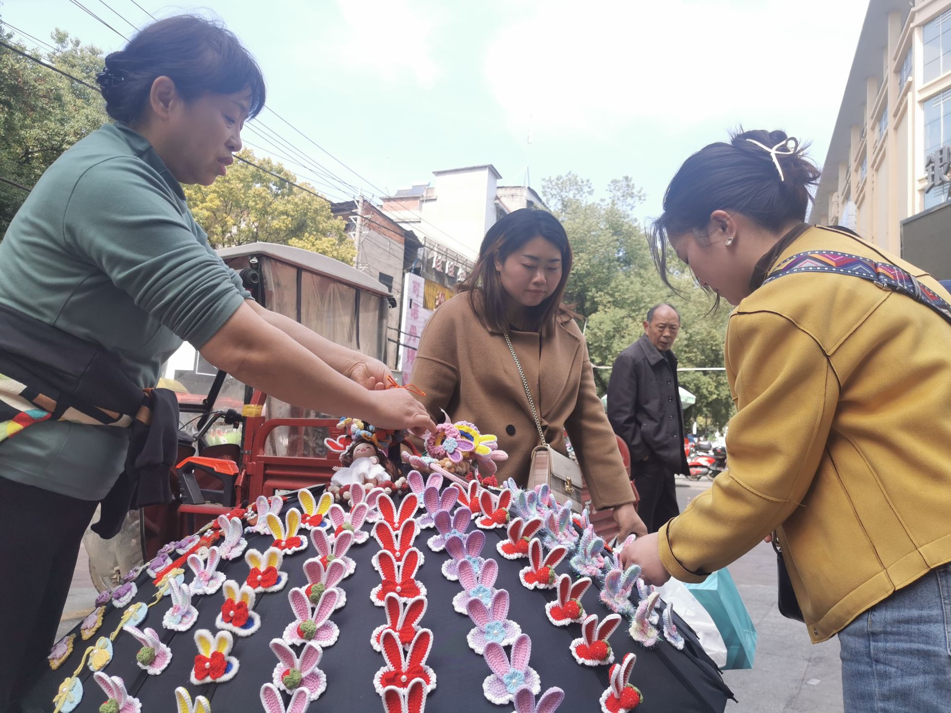 “刚开始钩织的毛线花很受大家的喜欢。”张晓红介绍说,毛线花钩织好后,她放在毛线店内给大家参观学习。后来,张晓红发现年轻人都喜欢小玩意。于是,她尝试着用毛线钩织头花、发卡和一些萌萌的小动物……渐渐地,她的家里和店里摆不下了,张晓红就买了小黑伞和小推车,将钩织好的发卡、头花别在小黑伞上,毛线花放在小推车里,组成“移动花摊”街头巷尾开始售卖。