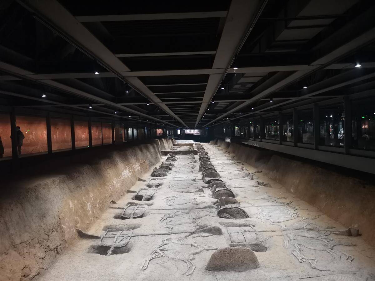 1号车马坑已发掘950平方米,约占三分之二,剩余部分因保护文物需要仍深埋于地下,仅覆盖一层白色薄膜做标识。1号车马坑已出土马车43辆,马匹165匹。贾汉清称,依据中轴对称的特点推测,整个1号车马坑共葬马车66辆,马匹258匹。漫步展厅,只见马车排列井然有序,车轮、车厢、车伞等轮廓明显;马匹尸骨遗迹清晰,均匀分布在车舆两边。贾汉清称,这些马匹从骸骨判断,应是上等良驹。