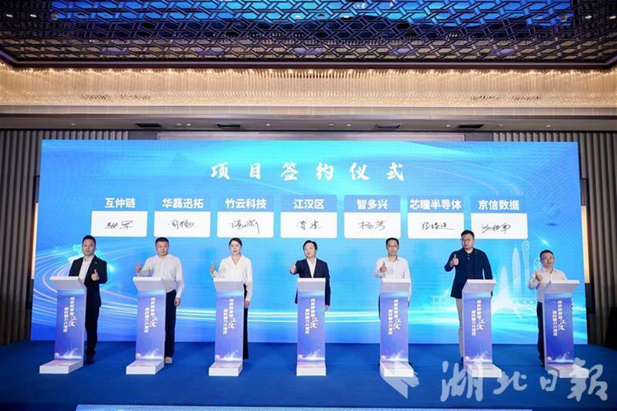 现场,深圳市博思高科技有限公司、恒生保泰(广东)科技有限公司、深圳前海数字贸易科技服务有限公司等12家企业与江汉区成功签约,达成包括智慧社区标准应用示范项目、美格智能华中区域总部项目、恒生保泰总部项目、华中数字贸易(跨境电商)产业园项目、华中总部智能制造数字工厂示范基地项目、江汉区数字商圈建设运营项目等方面的合作。