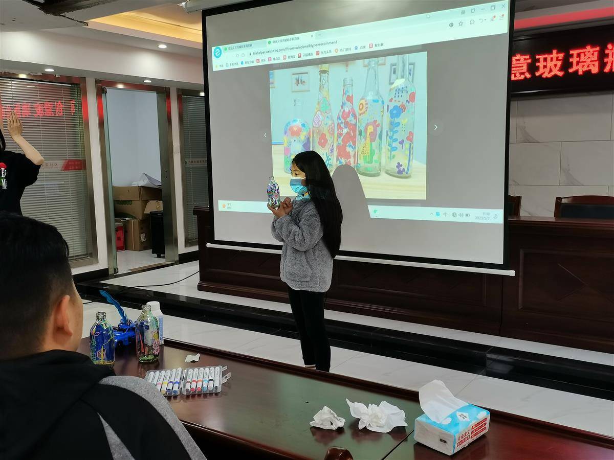 活动中,社工通过PPT向到场的居民、小朋友们介绍了彩绘作品,引导大家从中观察,讲解作品的线条深浅、色彩搭配、柔和度、图案等方面的特别之处及注意事项,激发大家潜在的兴趣和创作灵感。讲解结束后,小朋友们迫不及待地动起手来。彩绘玻璃瓶时,因为瓶子光滑,不好描画、也不容易干透,但大家很有耐心,描画得十分仔细,为了加快马克笔干透的速度,居民们用嘴吹、用手扇风……