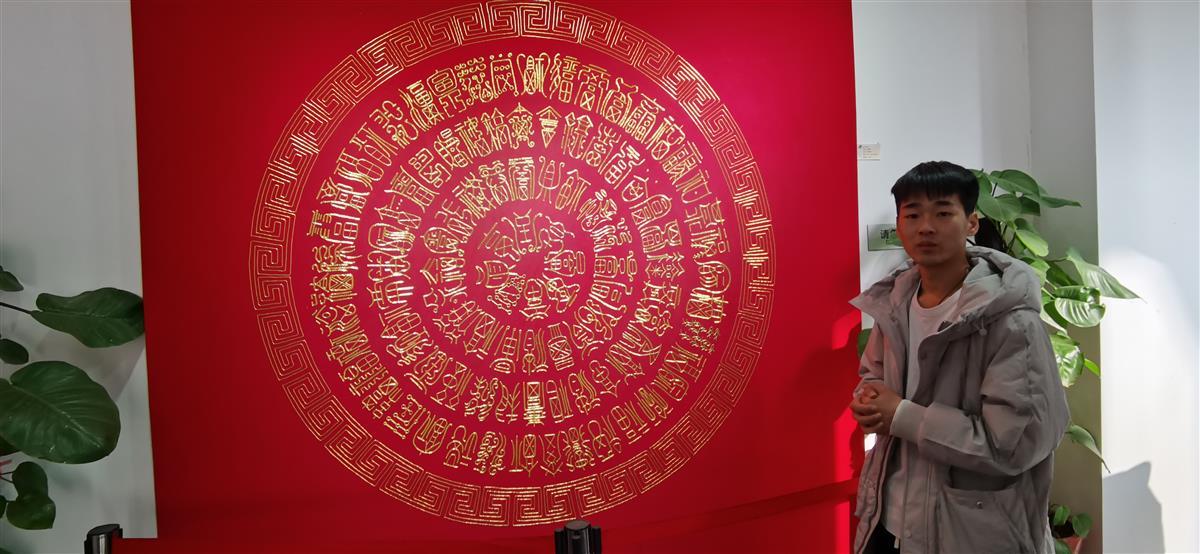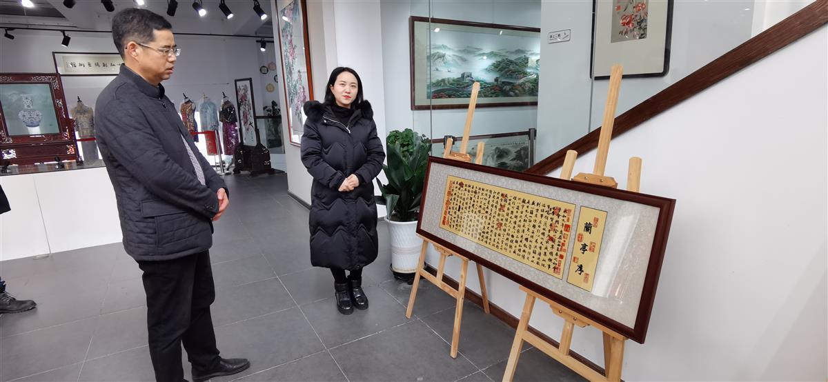 工作人员介绍的是该馆大冶刺绣作品《百福图》,由100种不同的福字样绣制而成。