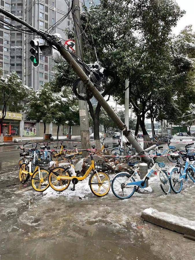 由于连夜降雪,路面湿滑,一辆私家车操作不慎将路边一根电线杆撞断,断裂的电线杆呈45度倾斜,随时有二次垮塌的危险。