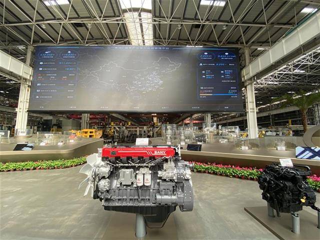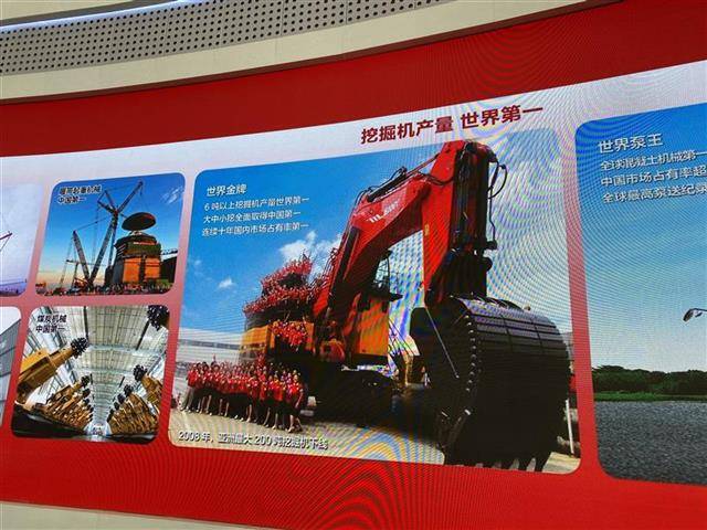 走进“灯塔工厂”前厅,“品质改变世界”几个大字赫然醒目,一旁的大型挖掘机、混凝土机械等产品实物品类丰富,吸引着不少前来洽谈的合作商驻足拍照。