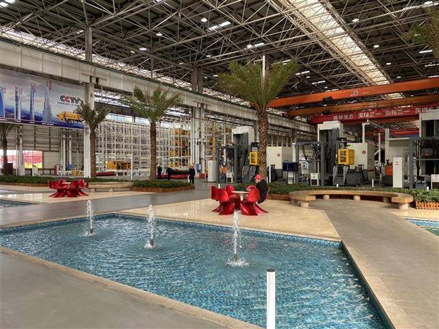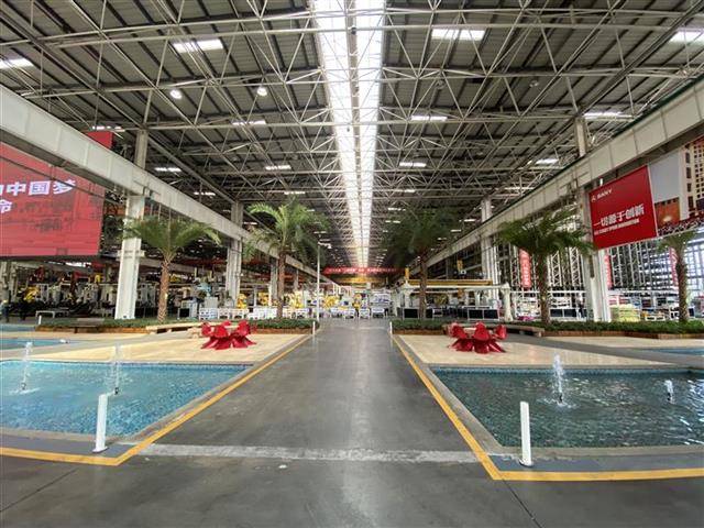 穿过工厂前厅,便是智能化装配车间。然而,首先映入眼帘的是绿树、鲜花、喷泉、池塘和成群的锦鲤。乍一看,就像走进了“后花园”。
