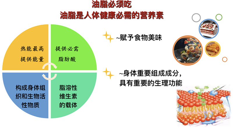 王教授:油脂必须吃,赋予食物美味之外,是身体重要组成成分,具有重要的生理功能。油脂是人体健康必需的营养素,其热能最高,提供能量,提供必需脂肪酸,构成身体组织和生物活性物质,是脂溶性维生素的载体。