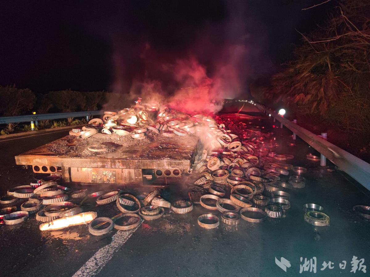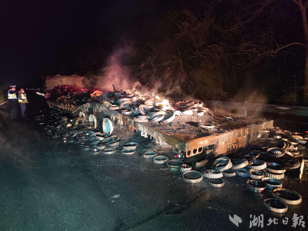 湖北日报客户端讯(通讯员王磊 全媒体记者丁心栓)3月18日凌晨12点30分,谷城消防救援大队接到报警,在G70福银高速丹江口往谷城方向1305处段,一辆满载物流包裹的平板挂车被熊熊大火包围,消防紧急赶赴现场。