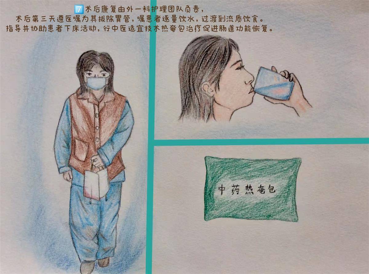 术后康复由肝胆外护理团队负责,术后第3天,遵医嘱为其拔除胃管,嘱患者逐量饮水,过渡到流质饮食。指导并协助患者下床活动,行中医适宜技术热奄包治疗促进肠道功能恢复。