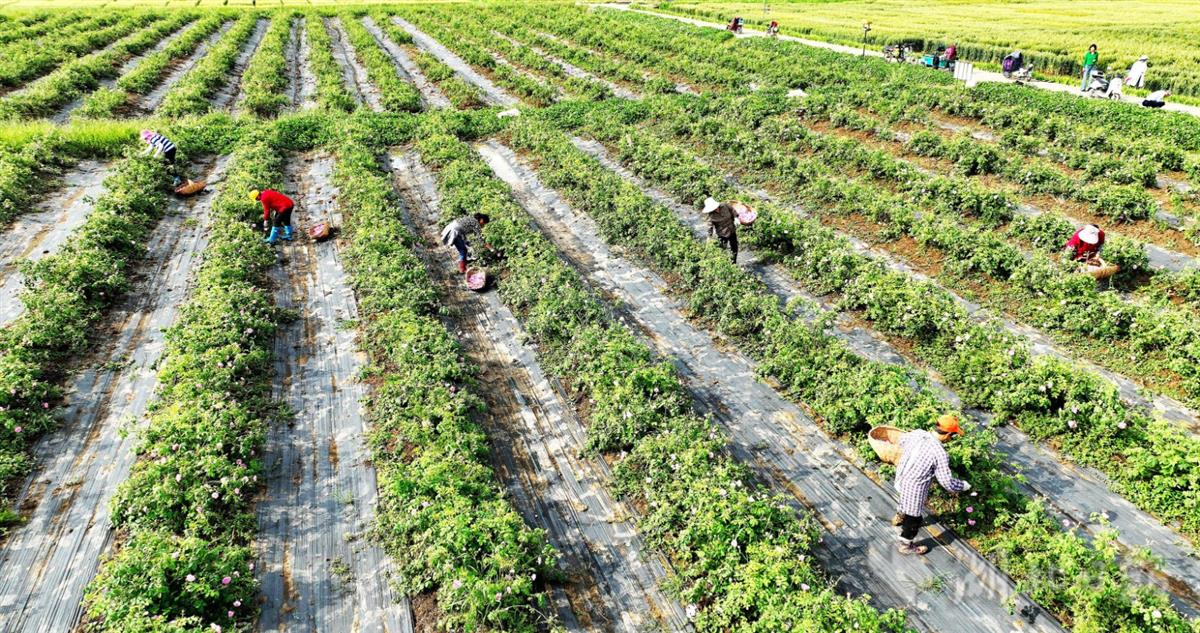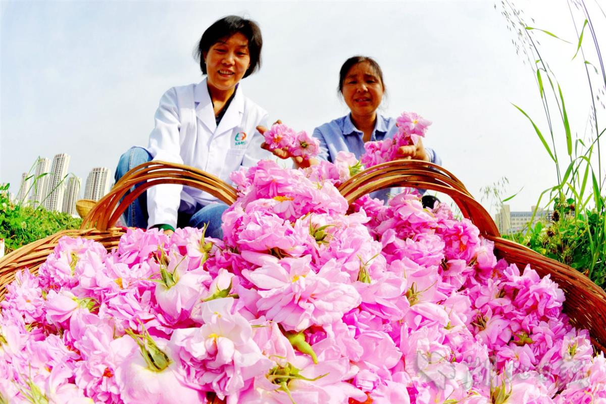 4月26日,在襄阳市农科院大马士革玫瑰基地,科研人员和工人正在采摘玫瑰花。该市农科院引种的大马士革玫瑰喜获丰收,当天采摘鲜花300公斤。