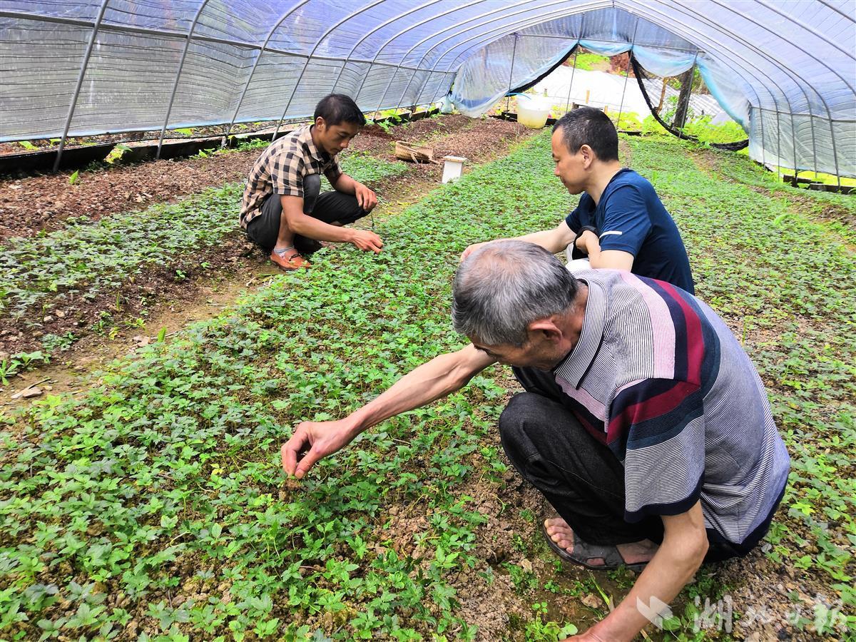 湖北日报客户端4月29日讯(通讯员郑家云)4月28日,宣恩县椿木营乡长槽村的药材种植户,正抢抓雨歇间隙在药园保温大棚内进行春季培管,有的除草、有的防虫、还有的在施生物有机肥。