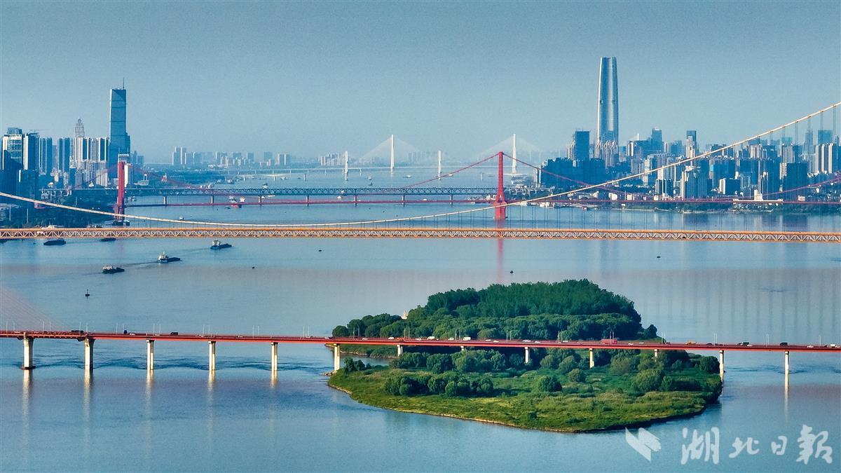 5月4日,武汉天气晴好,能见度极高,从高空俯瞰长江武汉段,水清岸美,6座跨江大桥尽收眼底。(由近到远为:武汉白沙洲大桥、杨泗港长江大桥、鹦鹉洲长江大桥、武汉长江大桥、武汉长江二桥、二七长江大桥。)(湖北日报全媒记者 柯皓 摄)