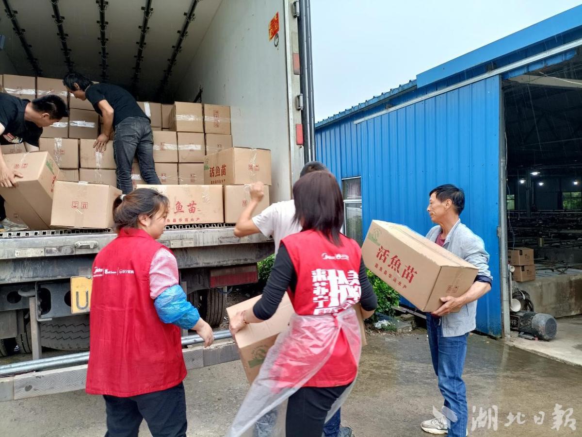 车间内,工作人员正有条不紊为斑点叉尾鮰鱼苗过称、灌氧打包,搬运工人配合默契地将打包好的鱼苗搬进准备运往外省的货车上。