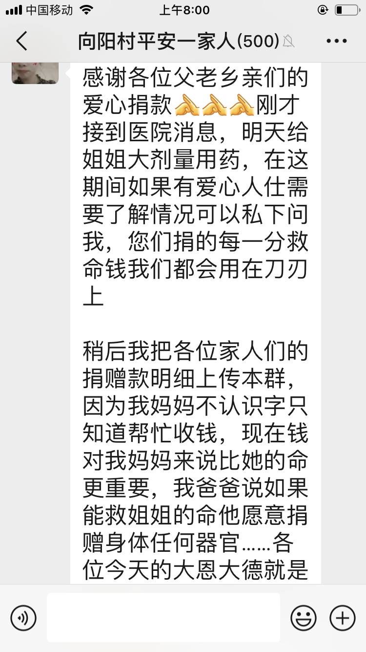 “谢谢!谢谢家乡父老乡亲的爱心捐助……”袁华萍的妹妹在群里感谢大家,并把大家的捐助一一记下转交给在医院救治的姐姐。