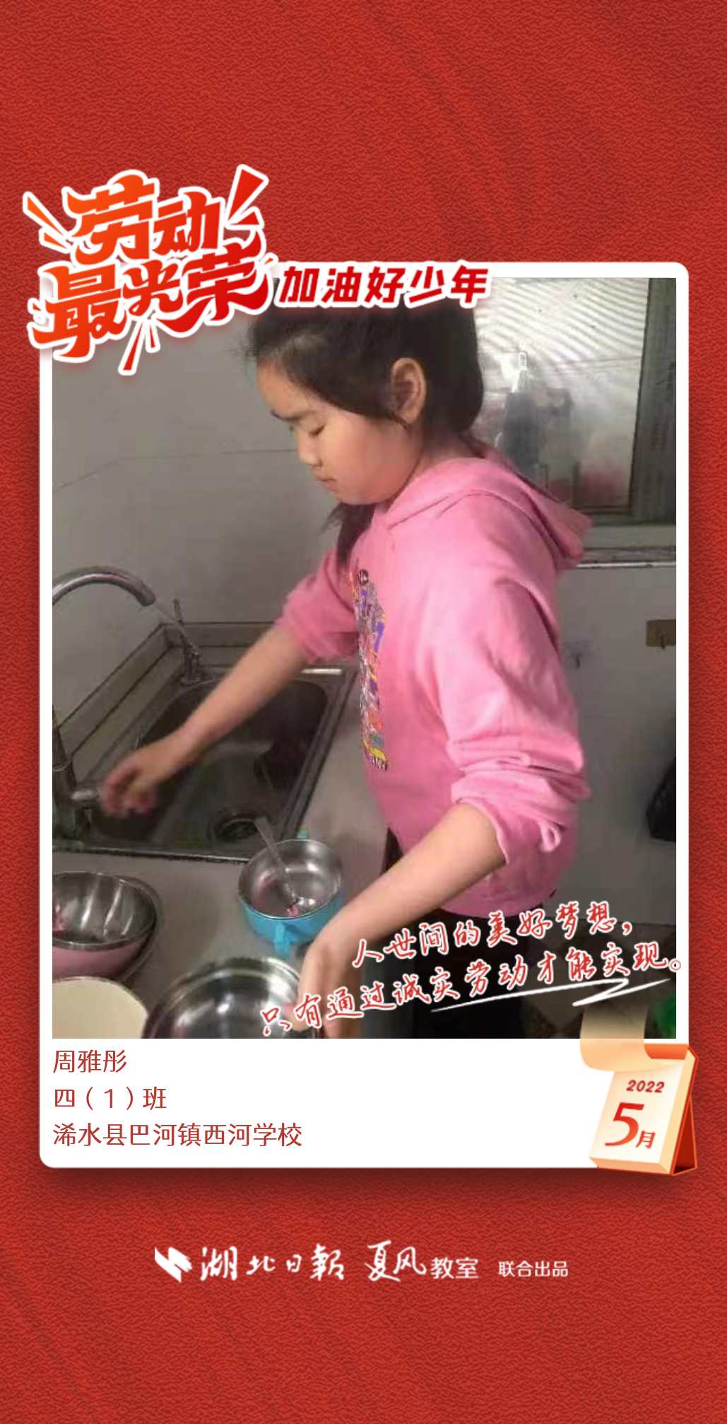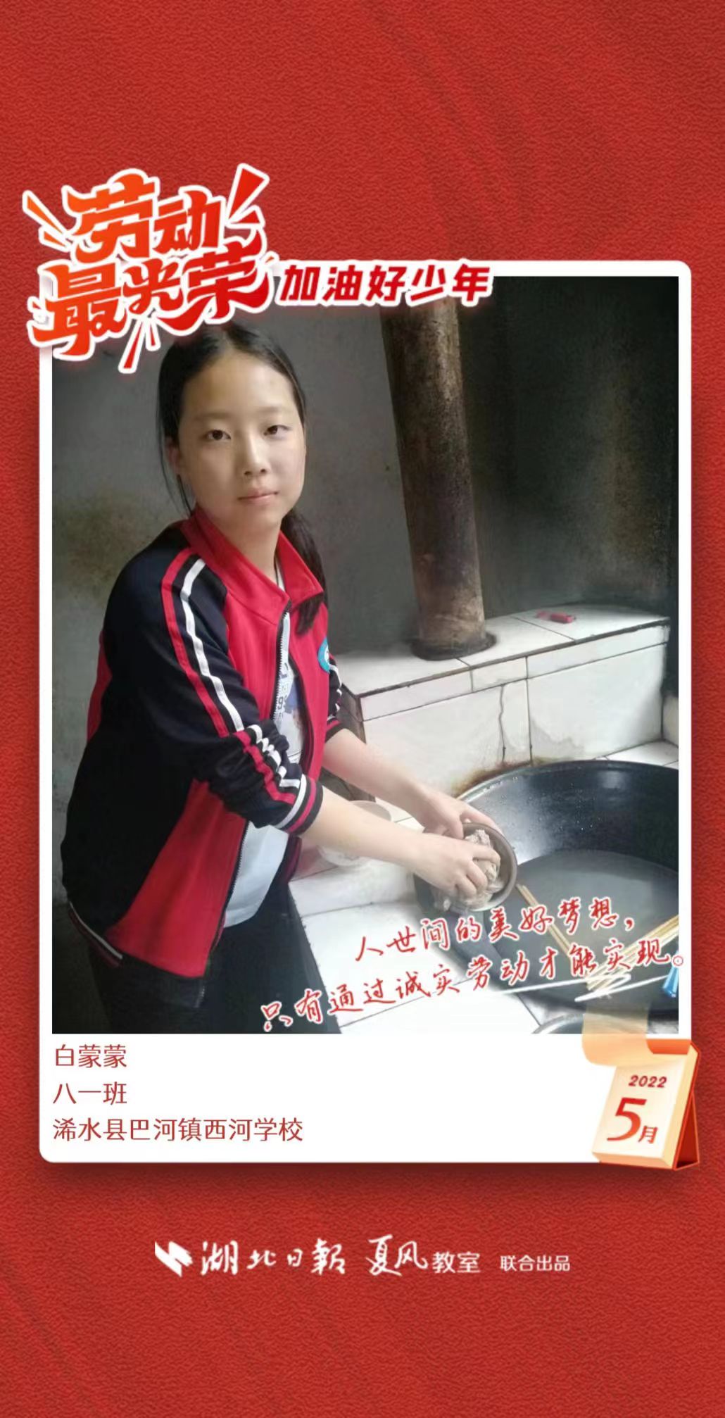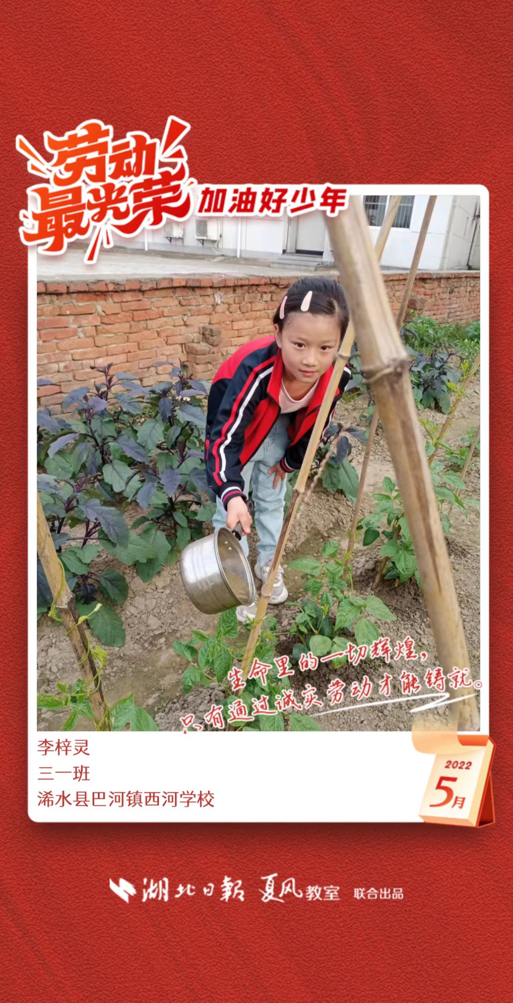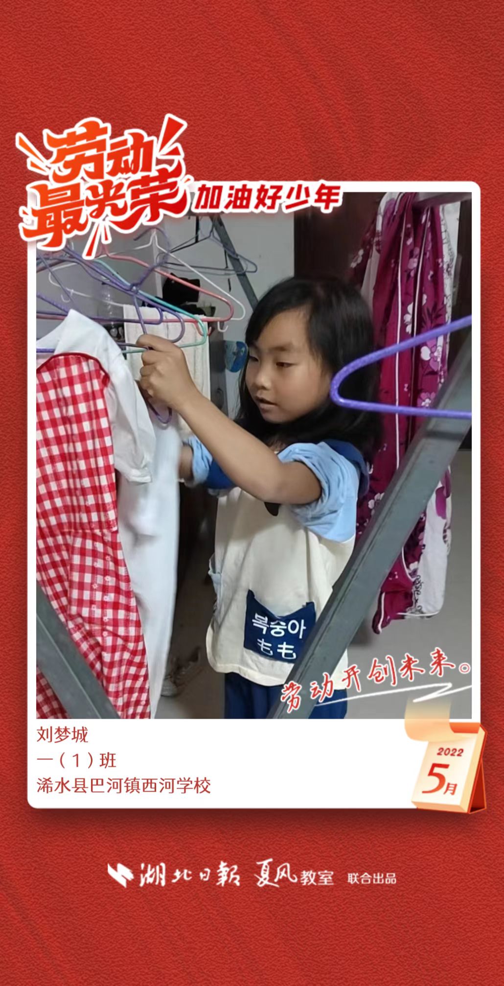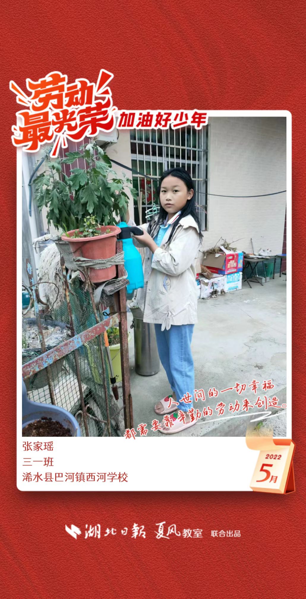 3、填写学生信息,自愿上传学生劳动照片即可,一键生成有“湖北日报”落款的个人专属海报,长按图片下载保存。