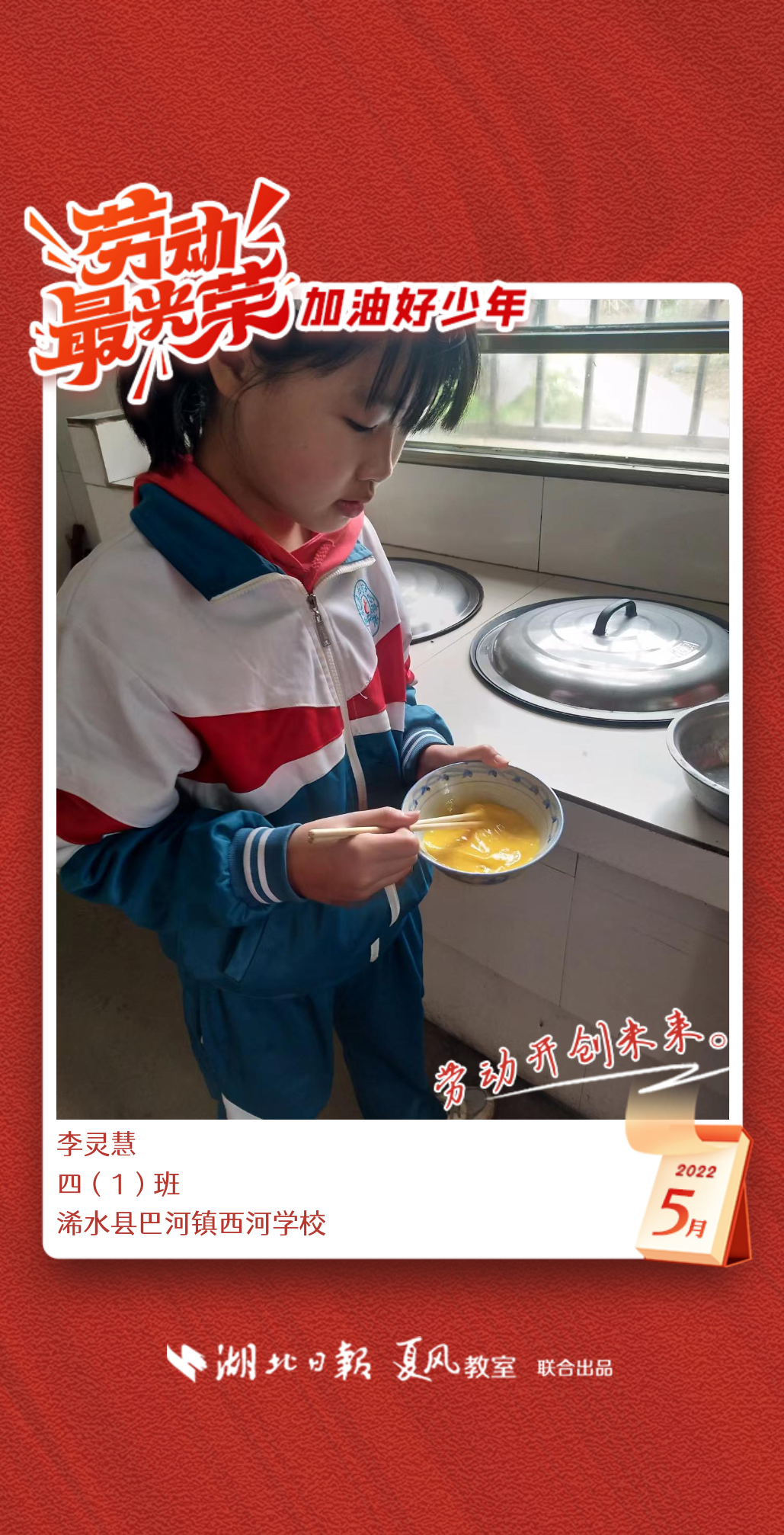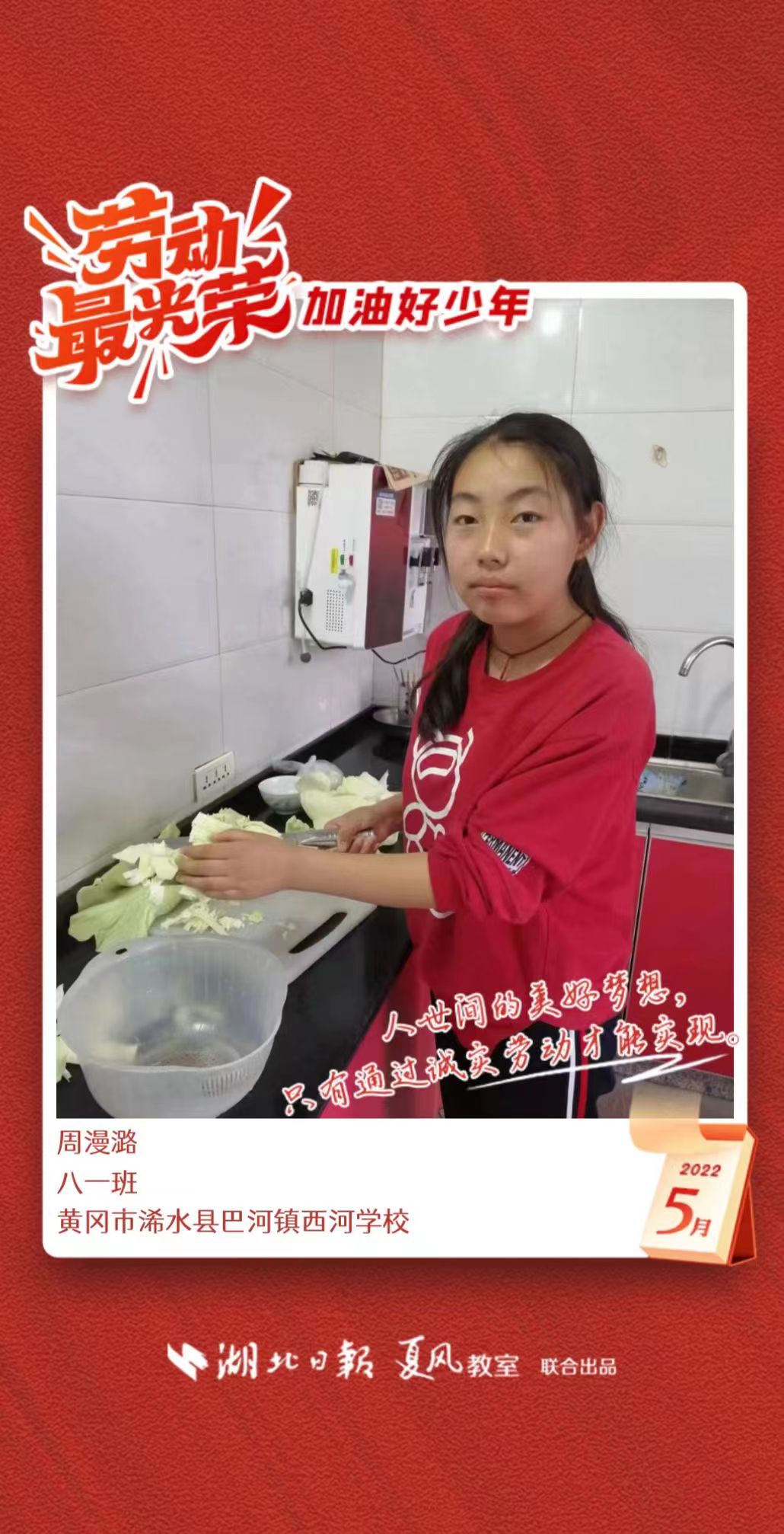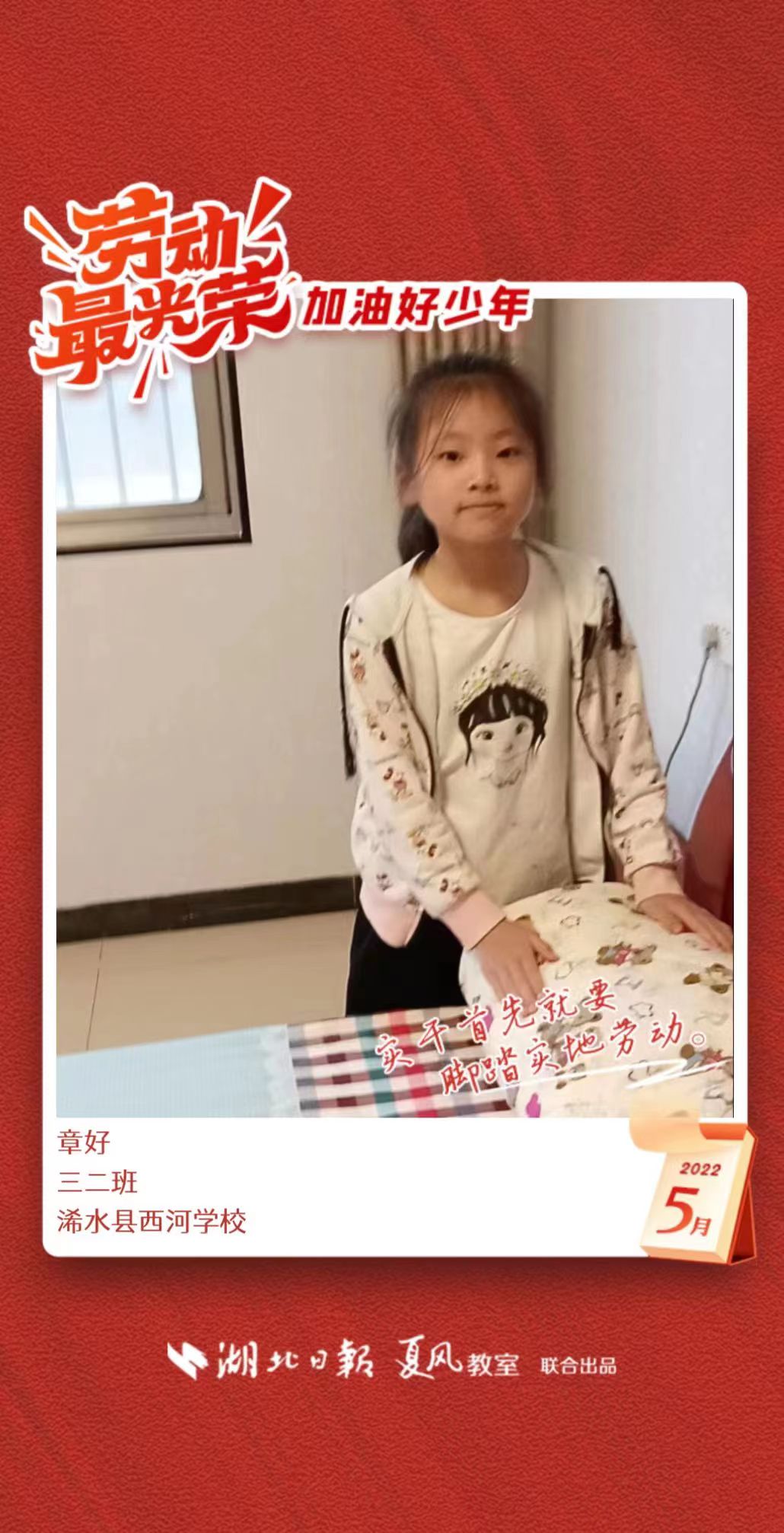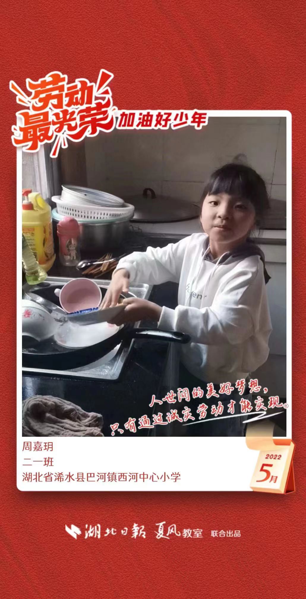 3、填写学生信息,自愿上传学生劳动照片即可,一键生成有“湖北日报”落款的个人专属海报,长按图片下载保存。