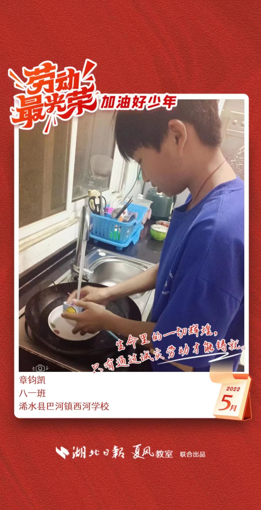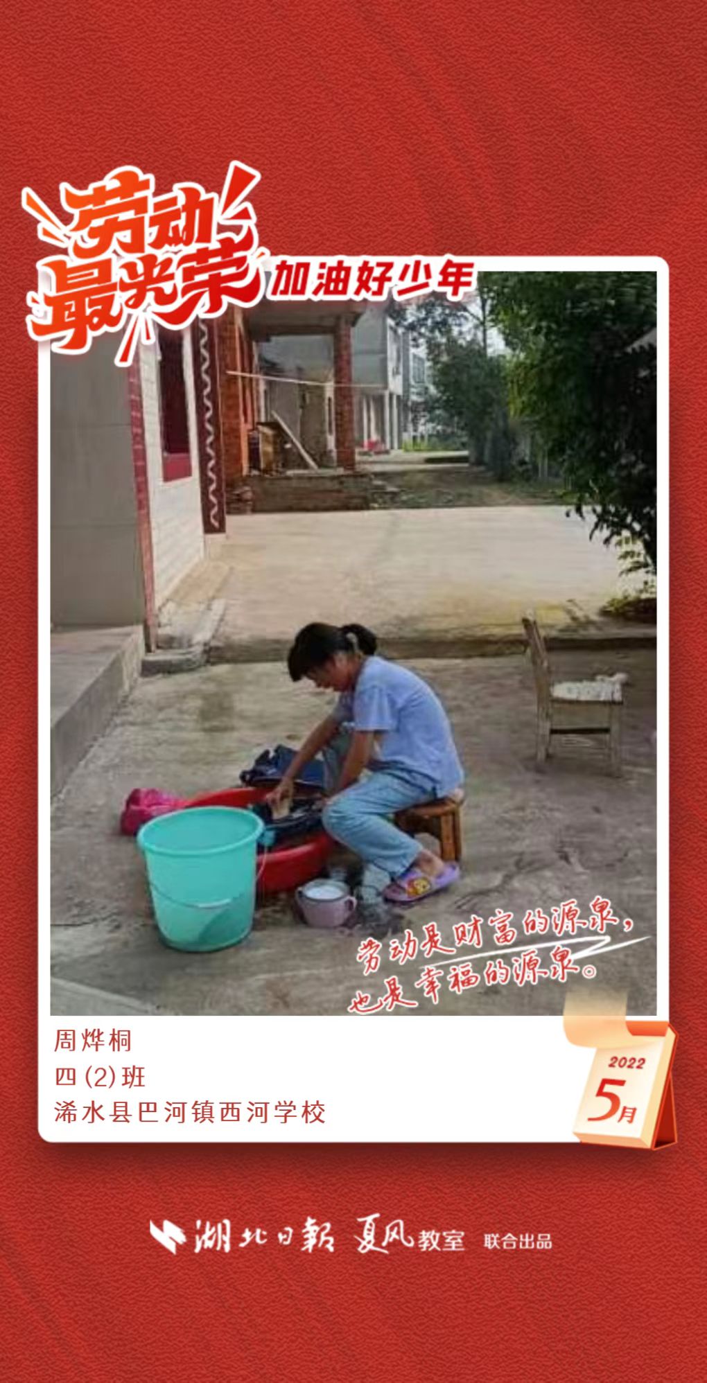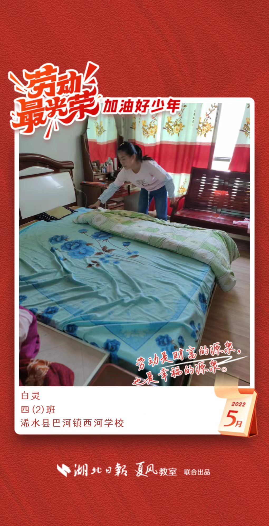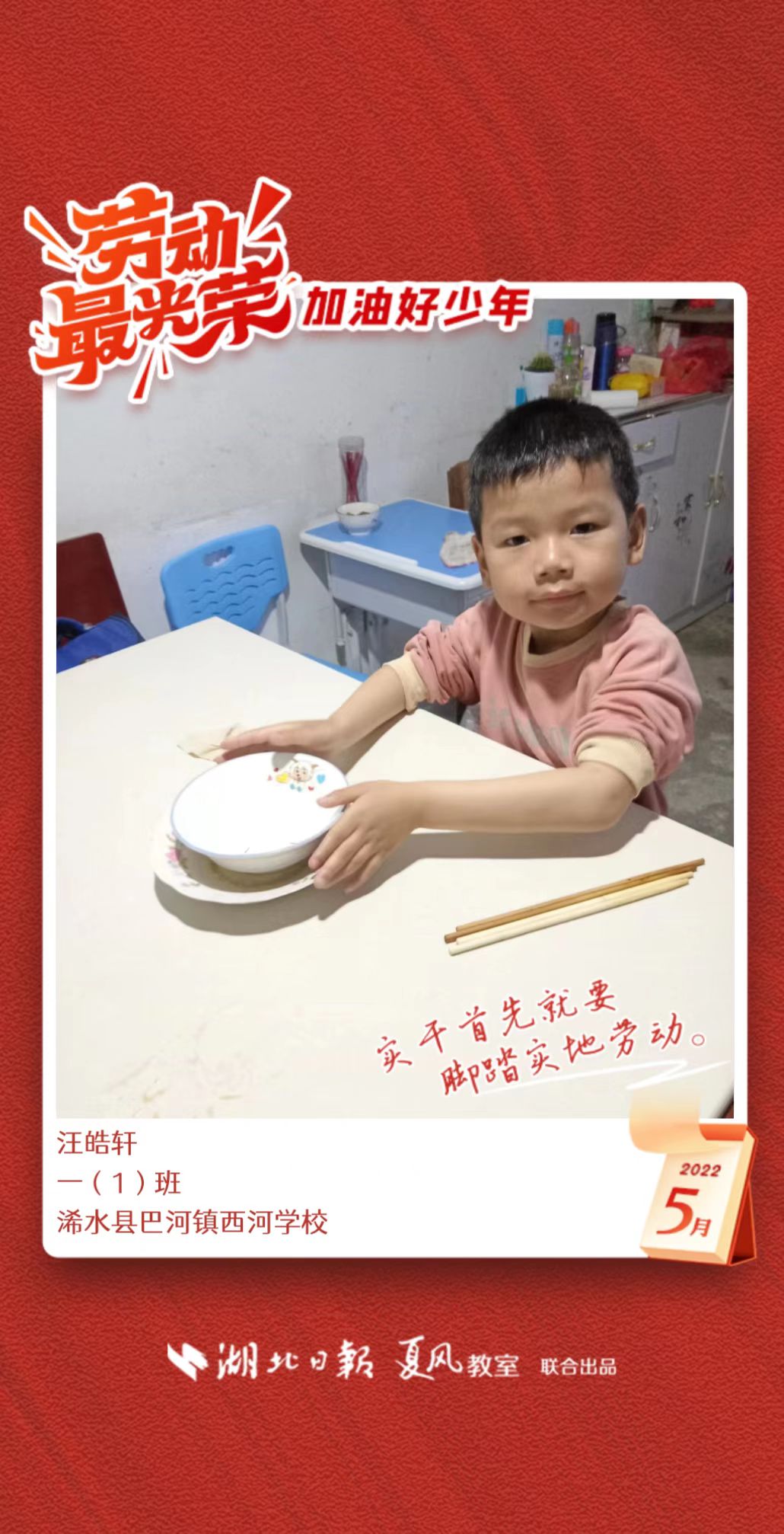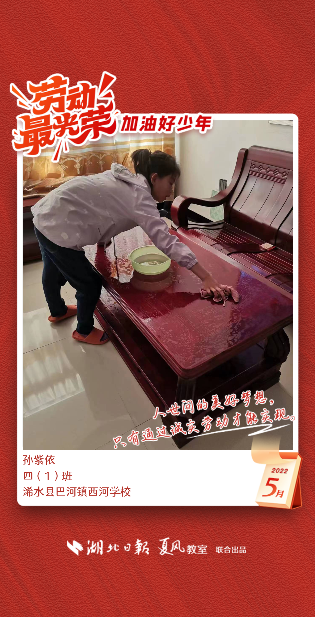 3、填写学生信息,自愿上传学生劳动照片即可,一键生成有“湖北日报”落款的个人专属海报,长按图片下载保存。