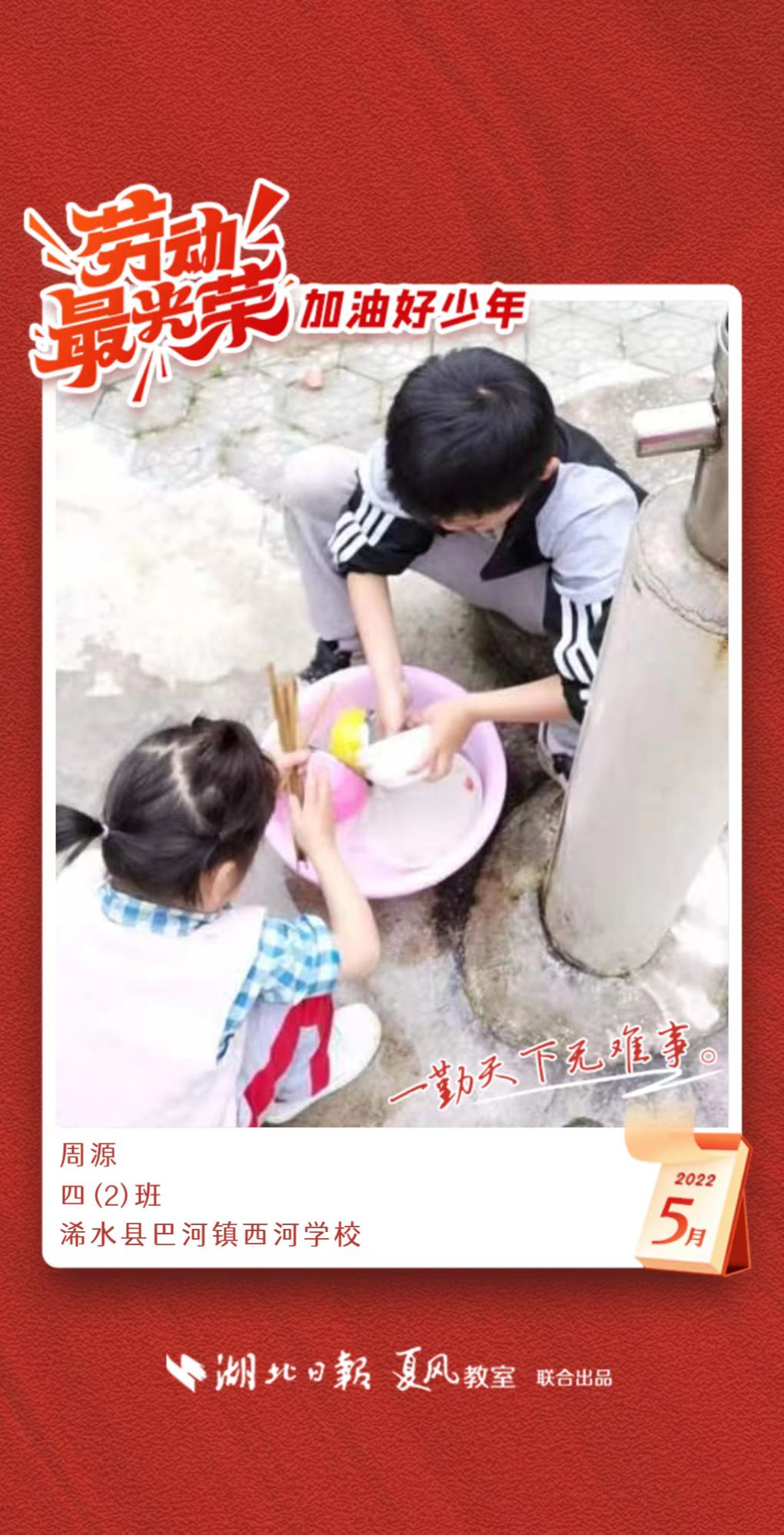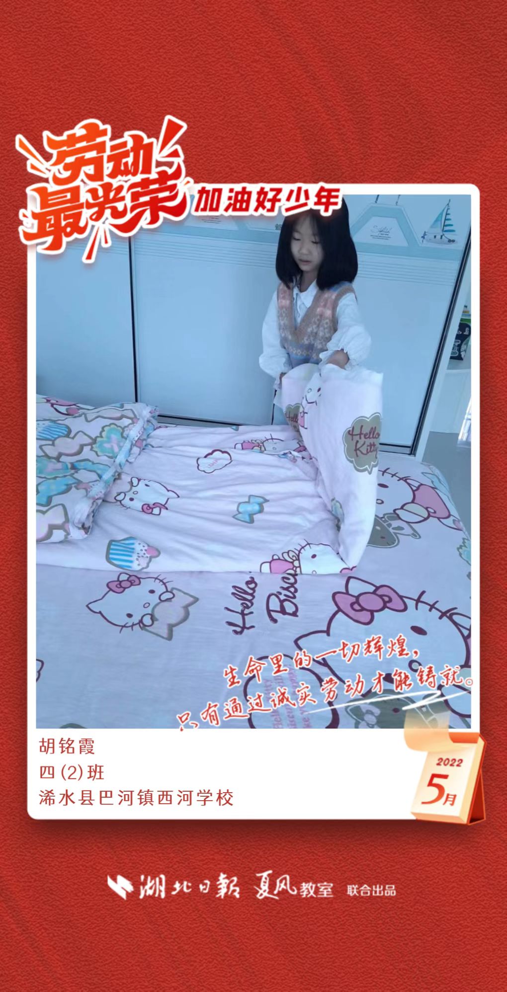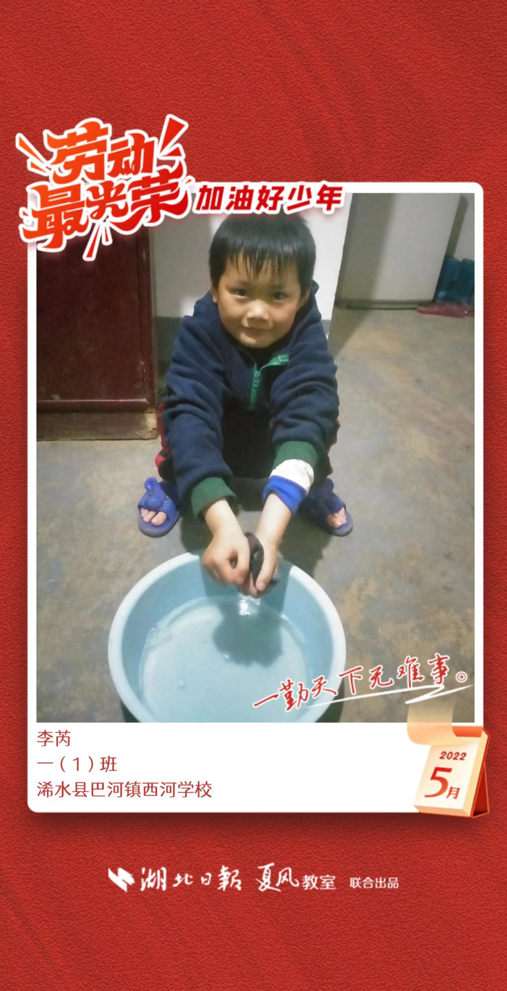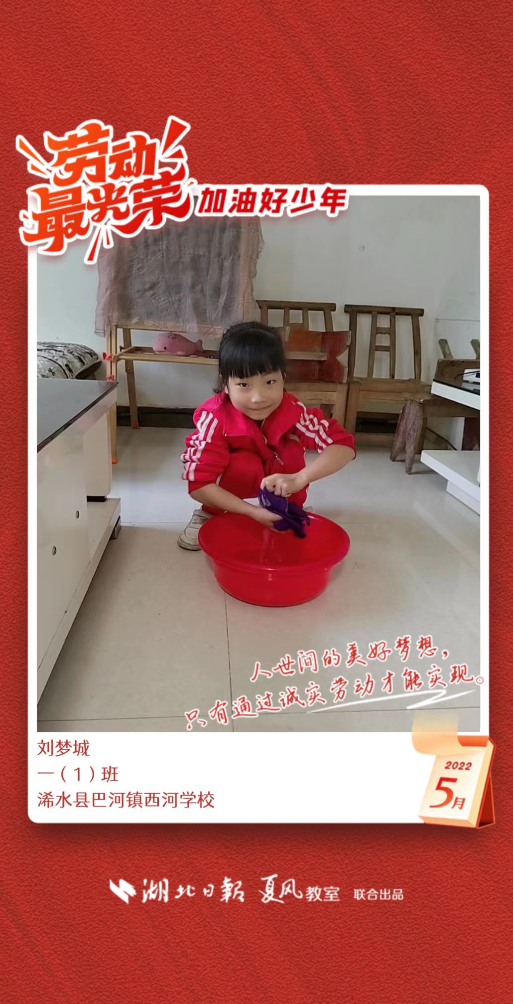 3、填写学生信息,自愿上传学生劳动照片即可,一键生成有“湖北日报”落款的个人专属海报,长按图片下载保存。